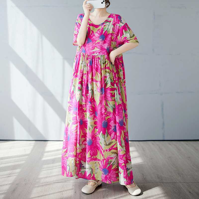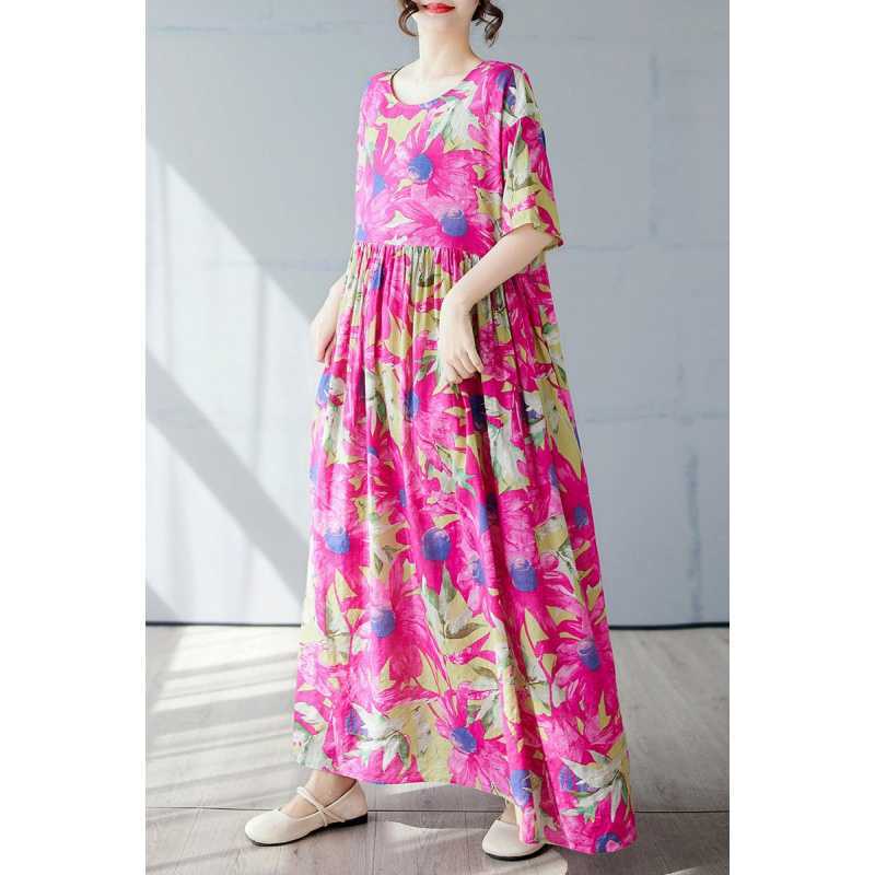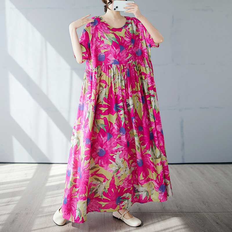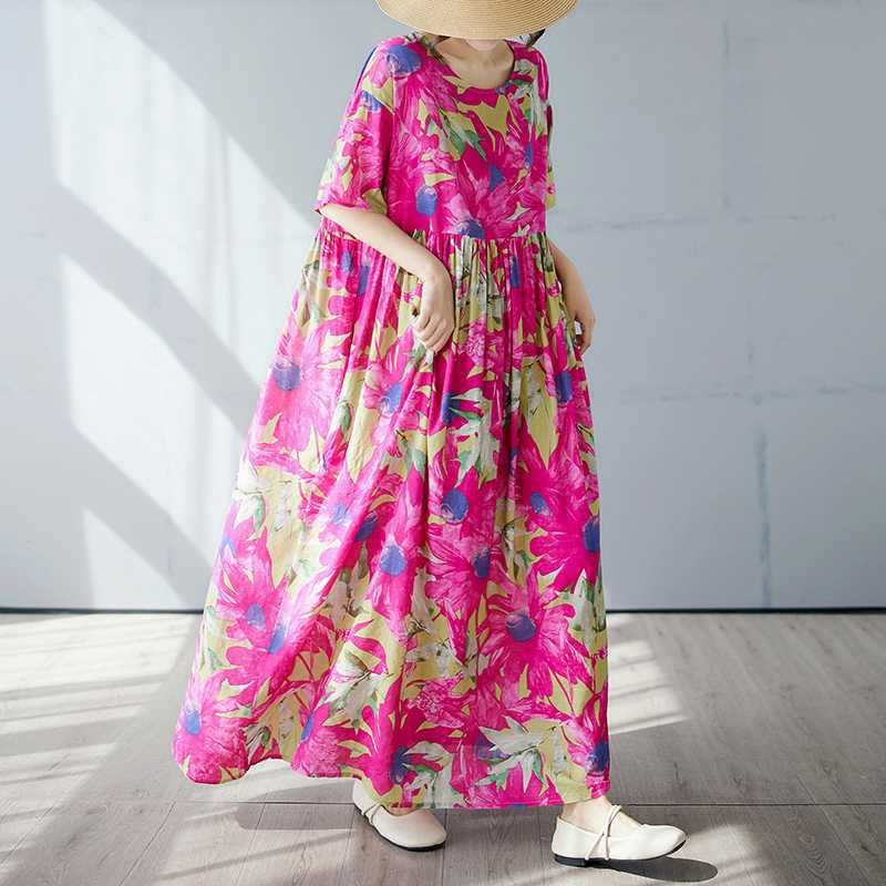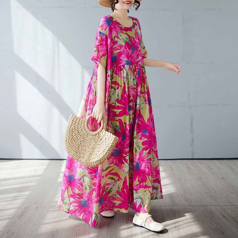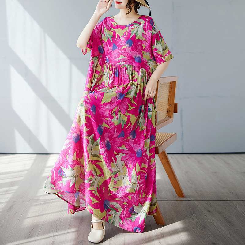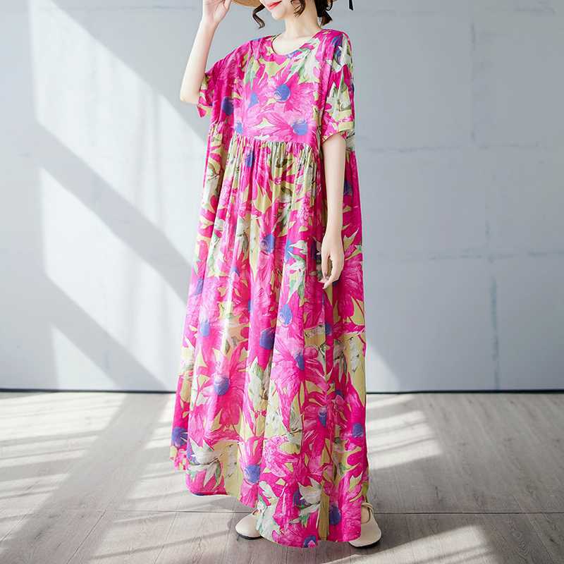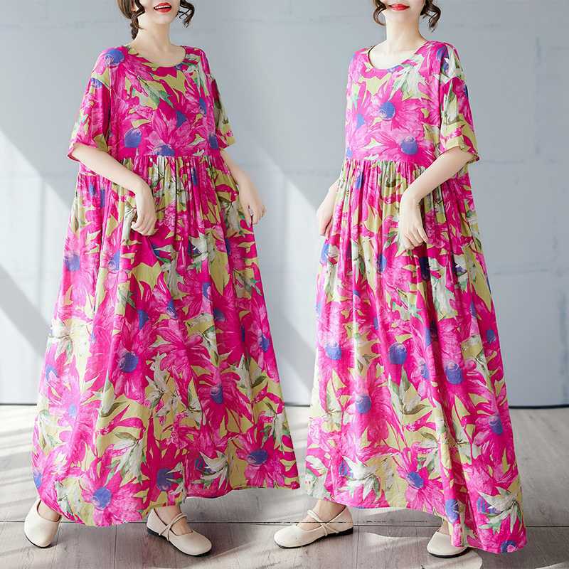 Простая и модная длинная юбка, летнее платье с короткими рукавами и круглым вырезом с принтом