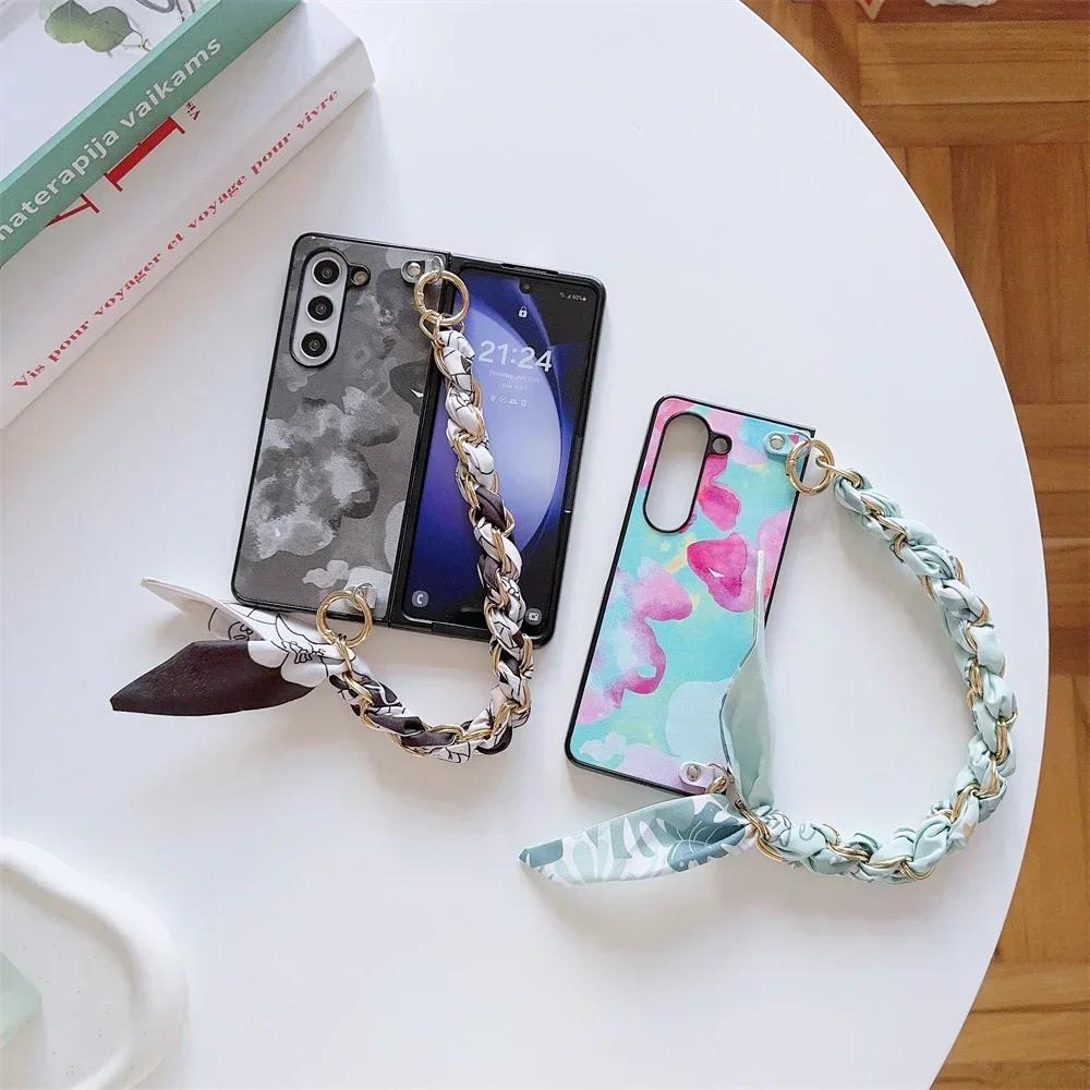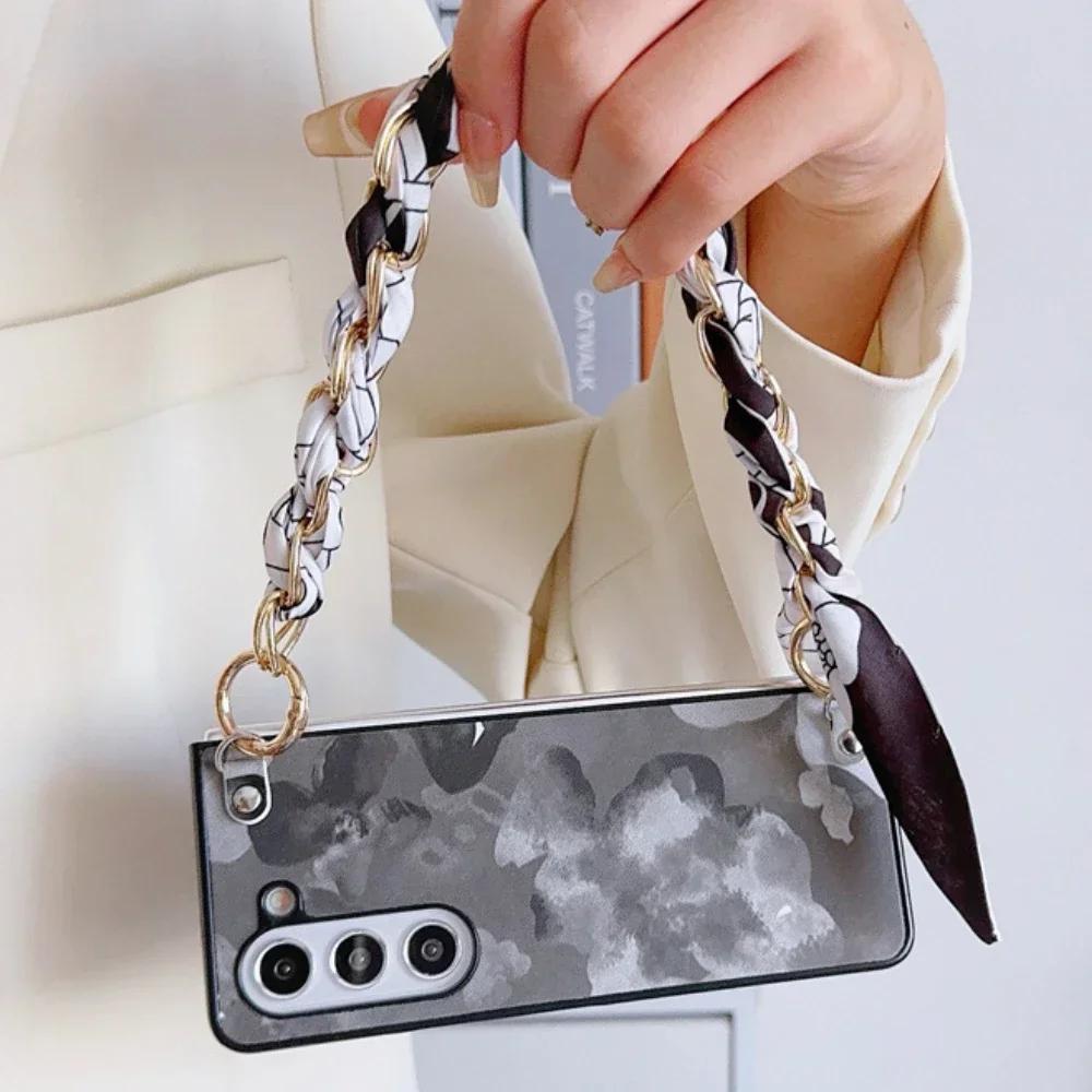 Милый цветущий чехол из ПУ кожи с шарфом, цепочка-ремешок на запястье в стиле сумочки для Samsung Galaxy Z Fold 6 5 4 3 5G, жесткий чехол для телефона