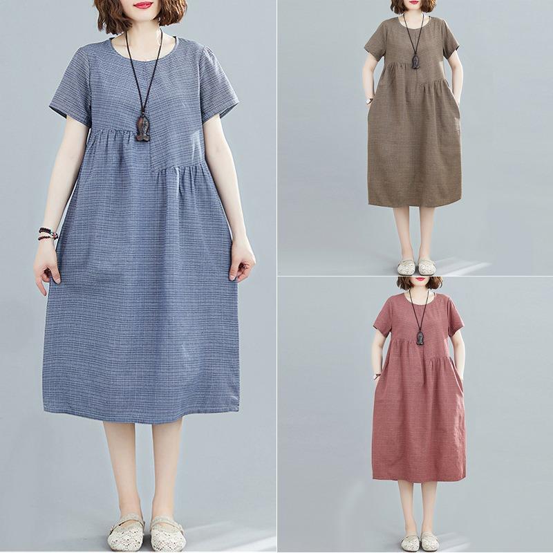 Реальное фото лето новый литературный свободный сращенный хлопок и лен клетчатый круглый вырез короткий рукав платье женская одежда средней длины — купить товар онлайн с бесплатной доставкой до всему миру!