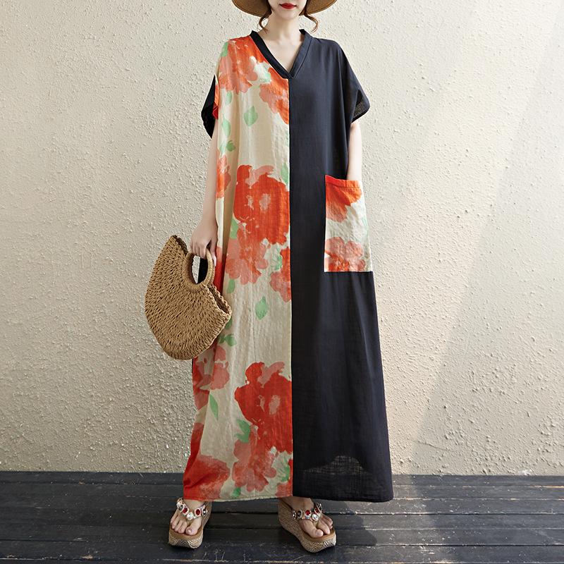 Платье миди с короткими рукавами, в стиле колор-блок, с ретро V-образным вырезом из хлопка и льна, которое скрывает фигуру и делает ее стройнее