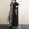 Хлопково-льняное художественное ретро-платье с V-образным вырезом, которое скрывает фигуру и стройнит. Женское длинное платье с короткими рукавами и цветными блоками.