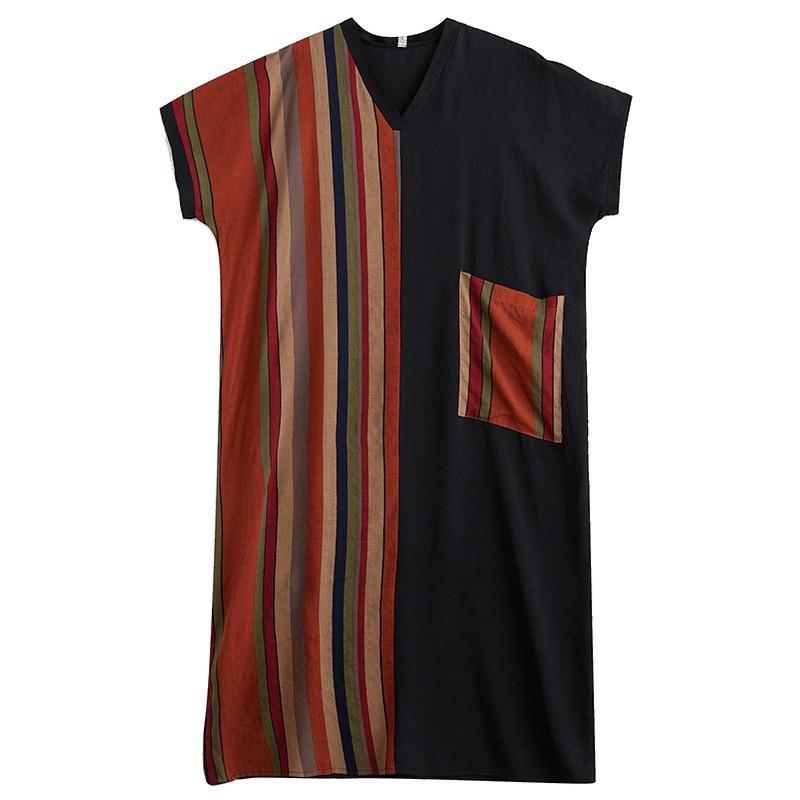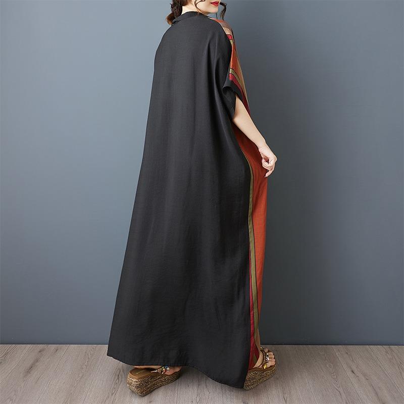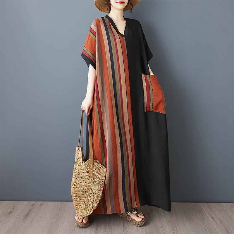Реальный кадр - Летний жир Мм Тонкий хлопок и лен Для прикрытия живота Стройность V-образный вырез Короткий рукав Контрастная цветная вставка Черное длинное платье.