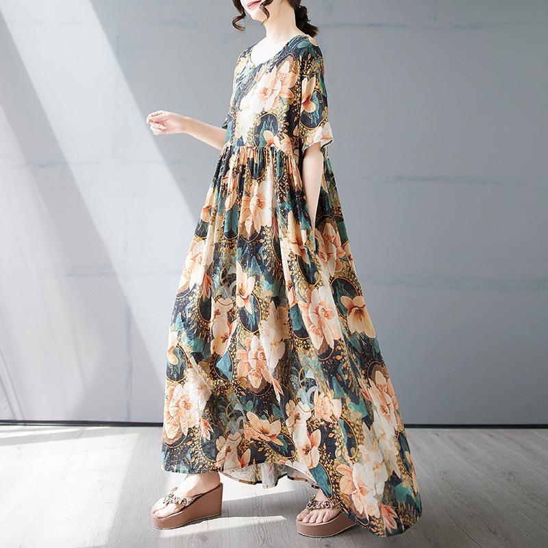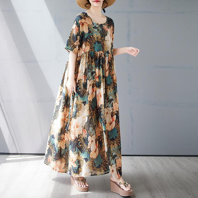 Летнее новое простое богемное длинное платье, расширенное и увеличенное, с короткими рукавами и круглым вырезом, с принтом, женская одежда