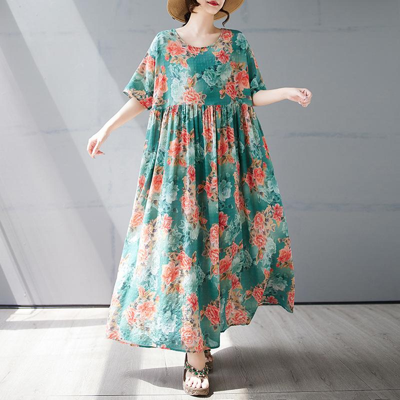 Летнее новое простое богемное длинное платье, расширенное и увеличенное, с короткими рукавами и круглым вырезом, с принтом, женская одежда