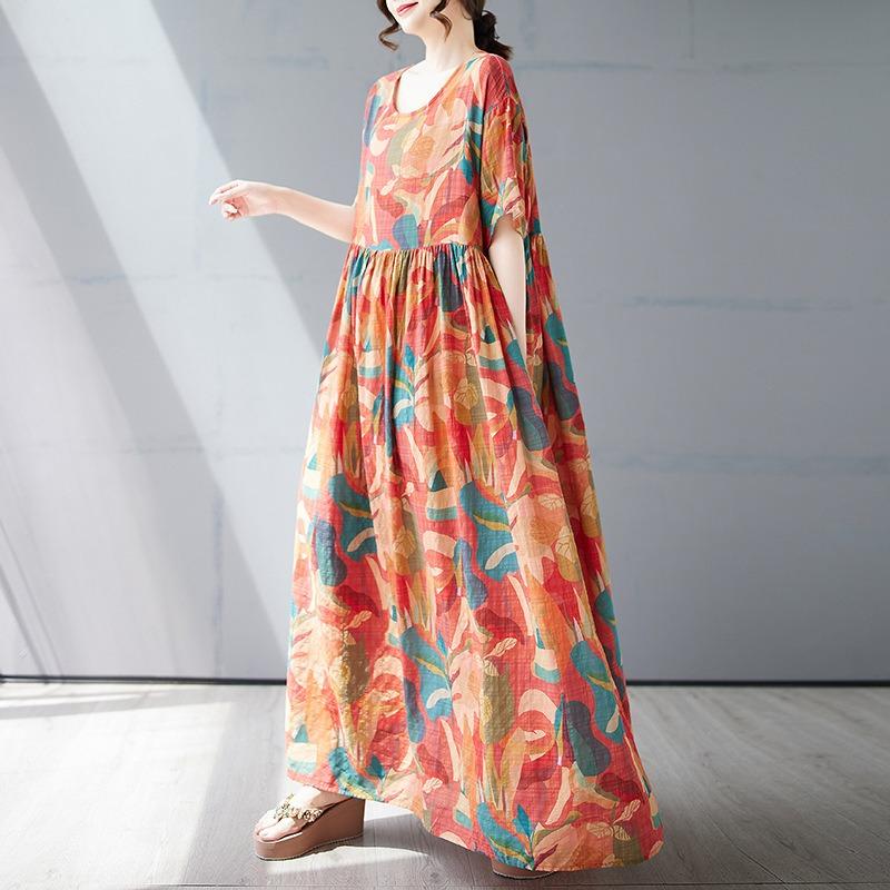 Летнее новое простое богемное длинное платье, расширенное и увеличенное, с короткими рукавами и круглым вырезом, с принтом, женская одежда