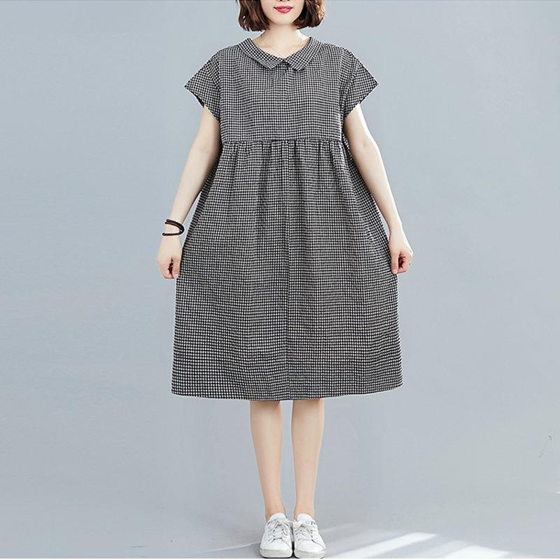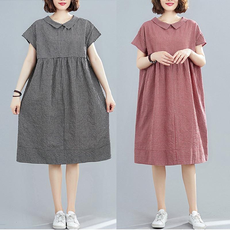 Реальное фото лето новый литературный большой размер свободный лоскутный хлопок и лен клетчатое платье с коротким рукавом женская одежда средней длины