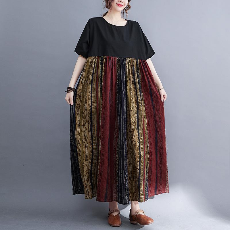 Реальное фото летнее новое литературное большого размера свободное хлопково-льняное платье с принтом с коротким рукавом женское длинное платье