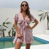 Летнее женское сексуальное мини-платье с глубоким v-образным вырезом и рюшами спереди и коротким рукавом, повседневное праздничное фото с фрагментарным цветочным принтом