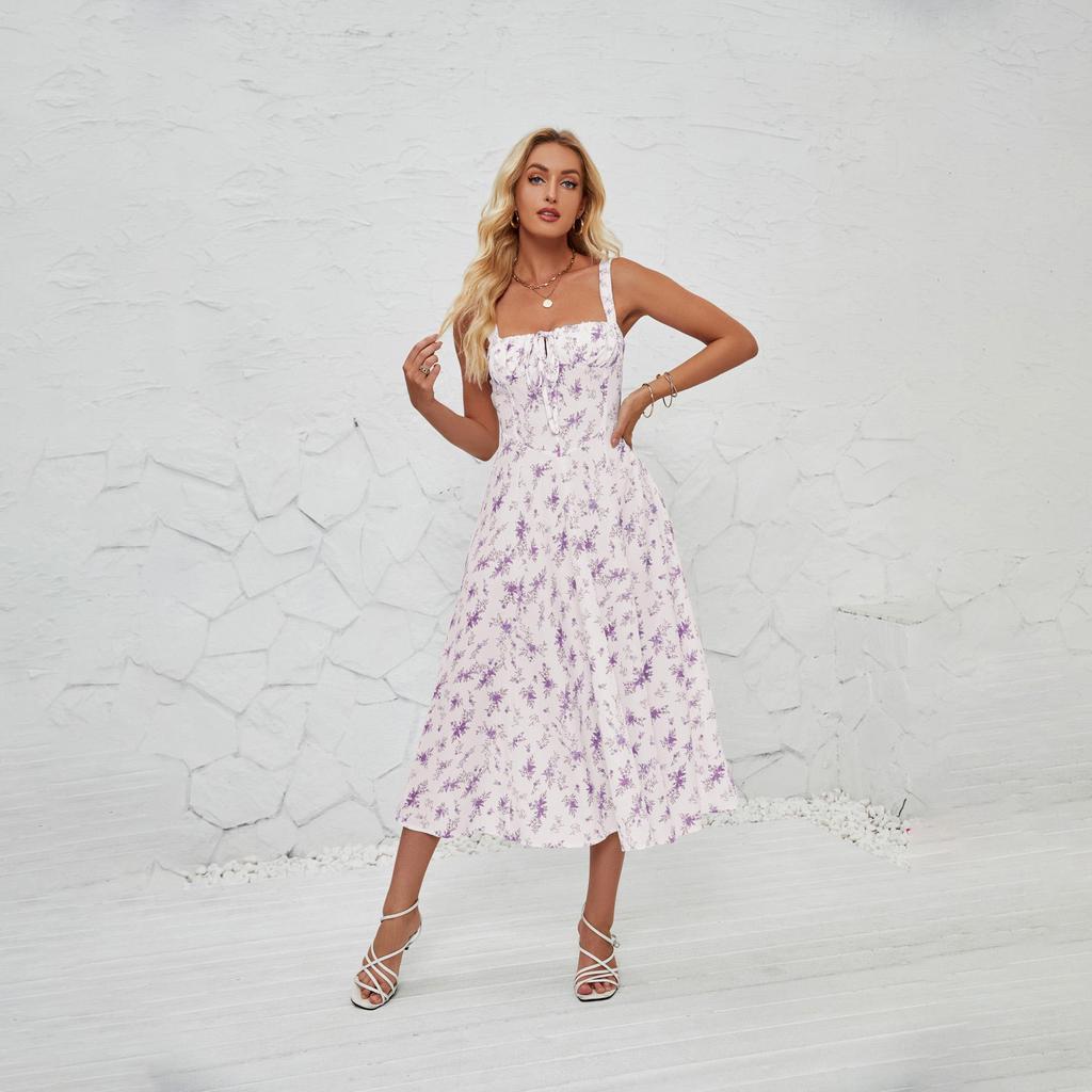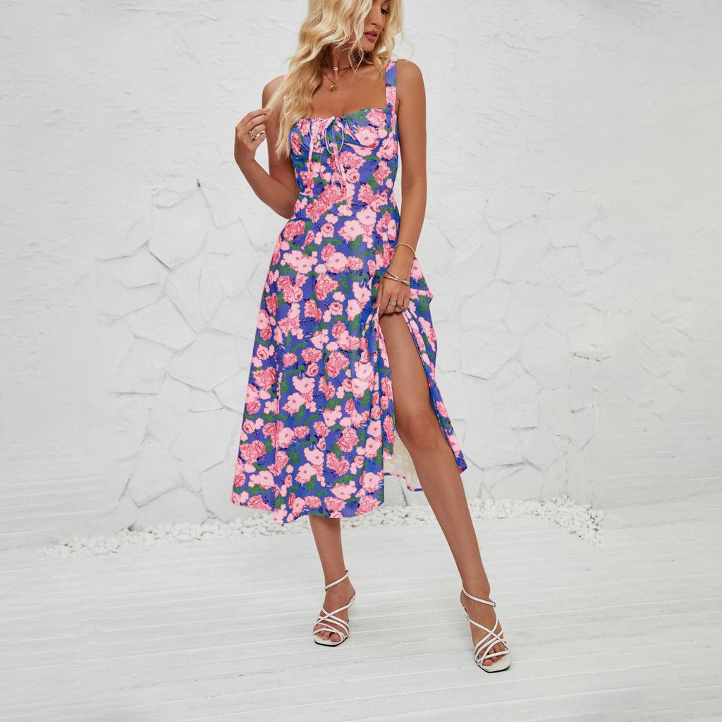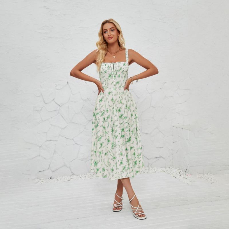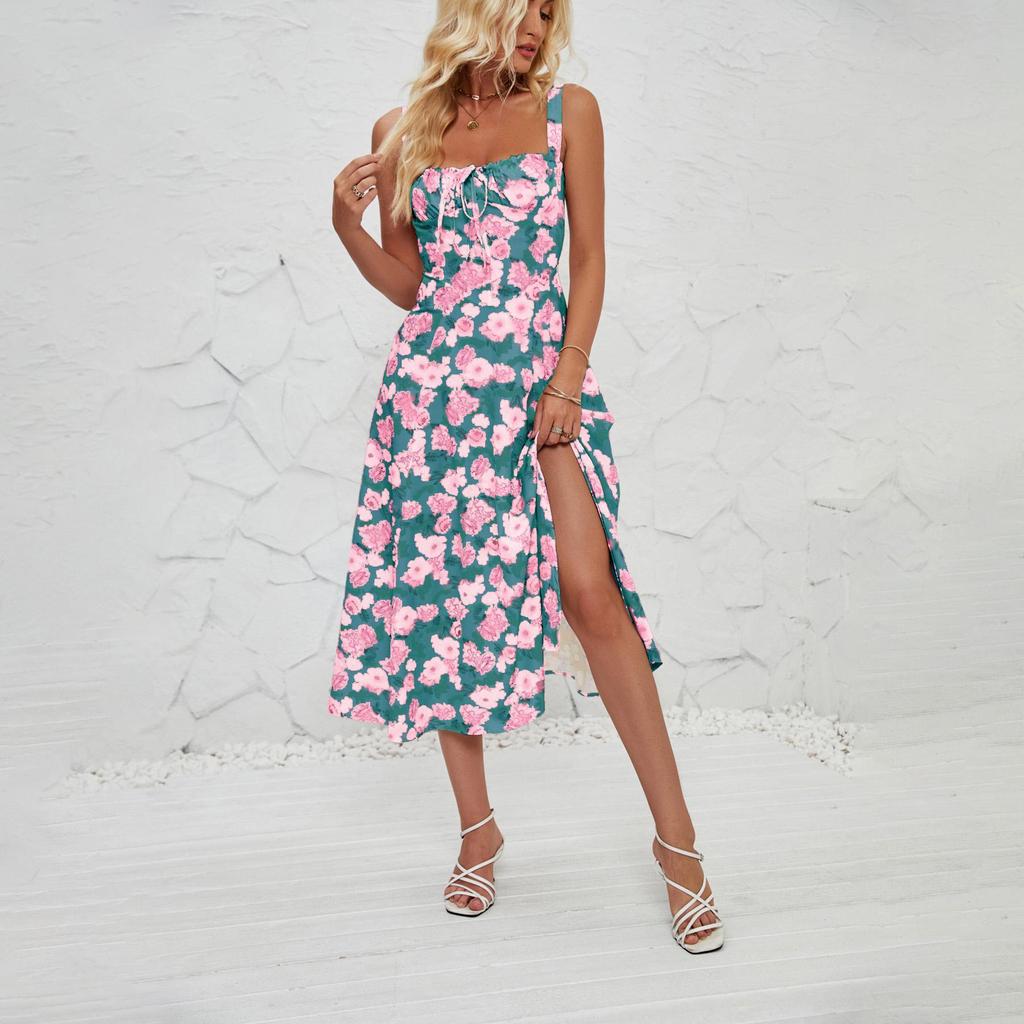 Летнее женское плиссированное платье длиной до щиколотки без рукавов с принтом и квадратным вырезом