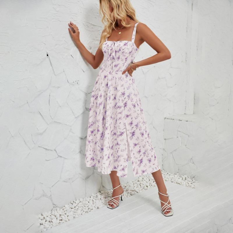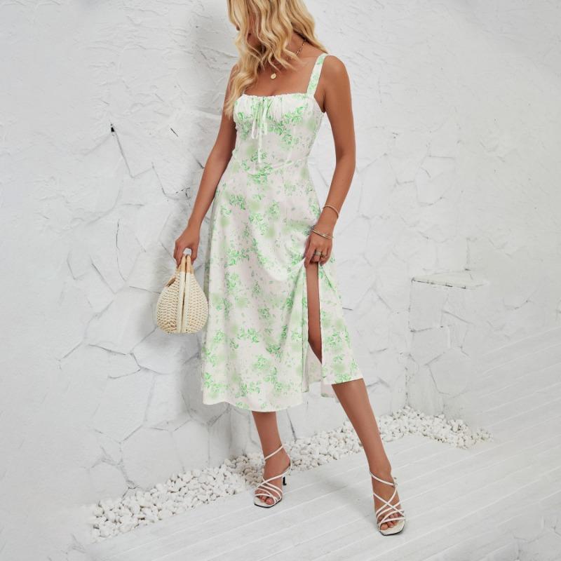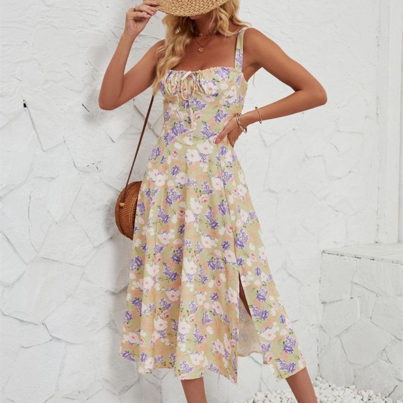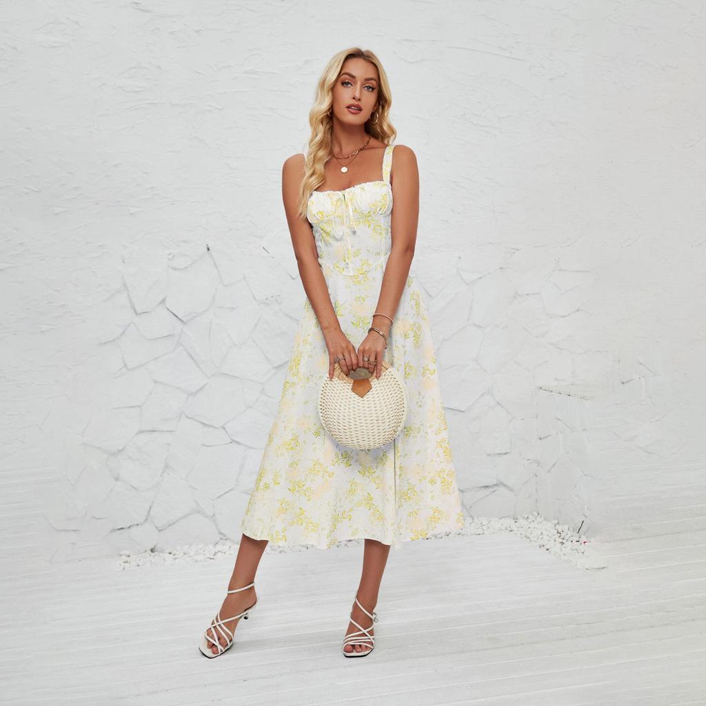 Летнее женское плиссированное платье длиной до щиколотки без рукавов с принтом и квадратным вырезом