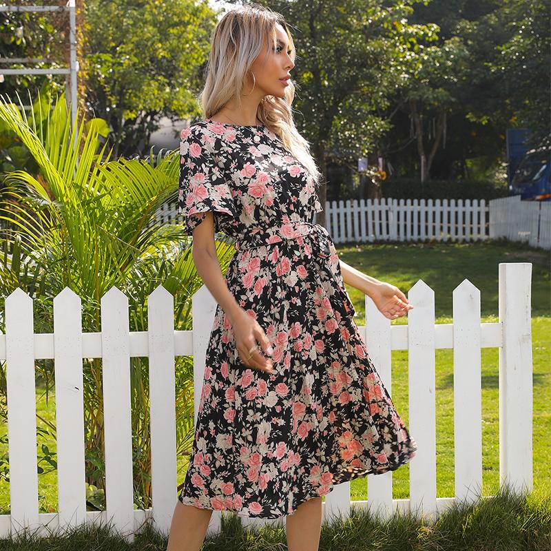 Лето-осеннее длинное платье с цветочным принтом, женское повседневное платье с круглым вырезом, короткими рукавами-бабочками, высокой талией, тонкое бандажное платье, S-XL