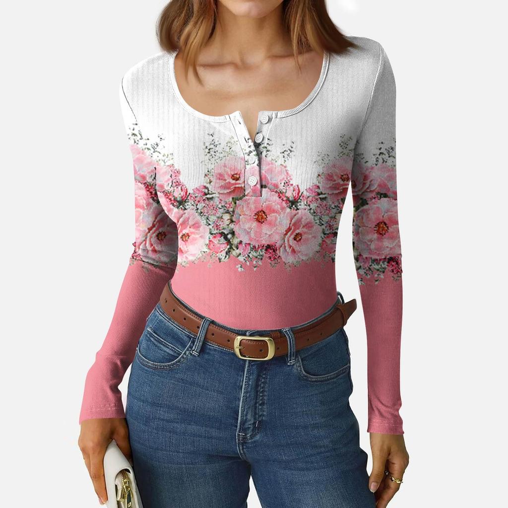 Женская приталенная футболка Модная повседневная с градиентным принтом Пуловер с круглым вырезом и длинным рукавом
