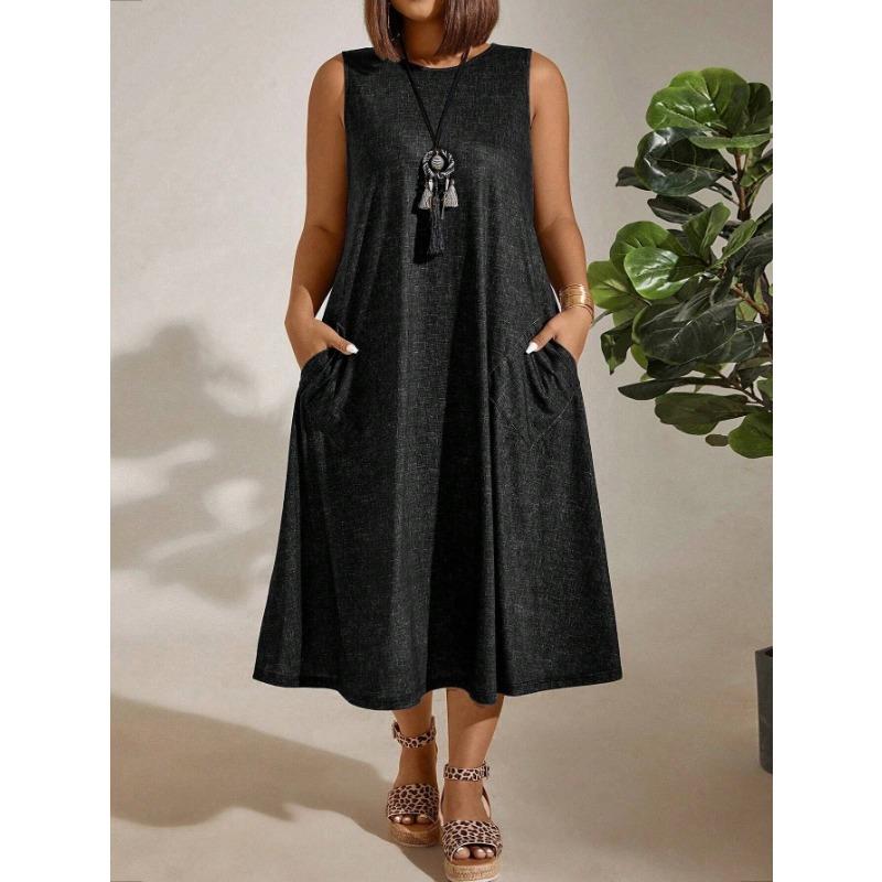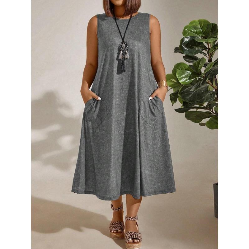 YYFS Женская мода лето весна однотонный принт без рукавов с круглым вырезом свободная талия повседневные платья