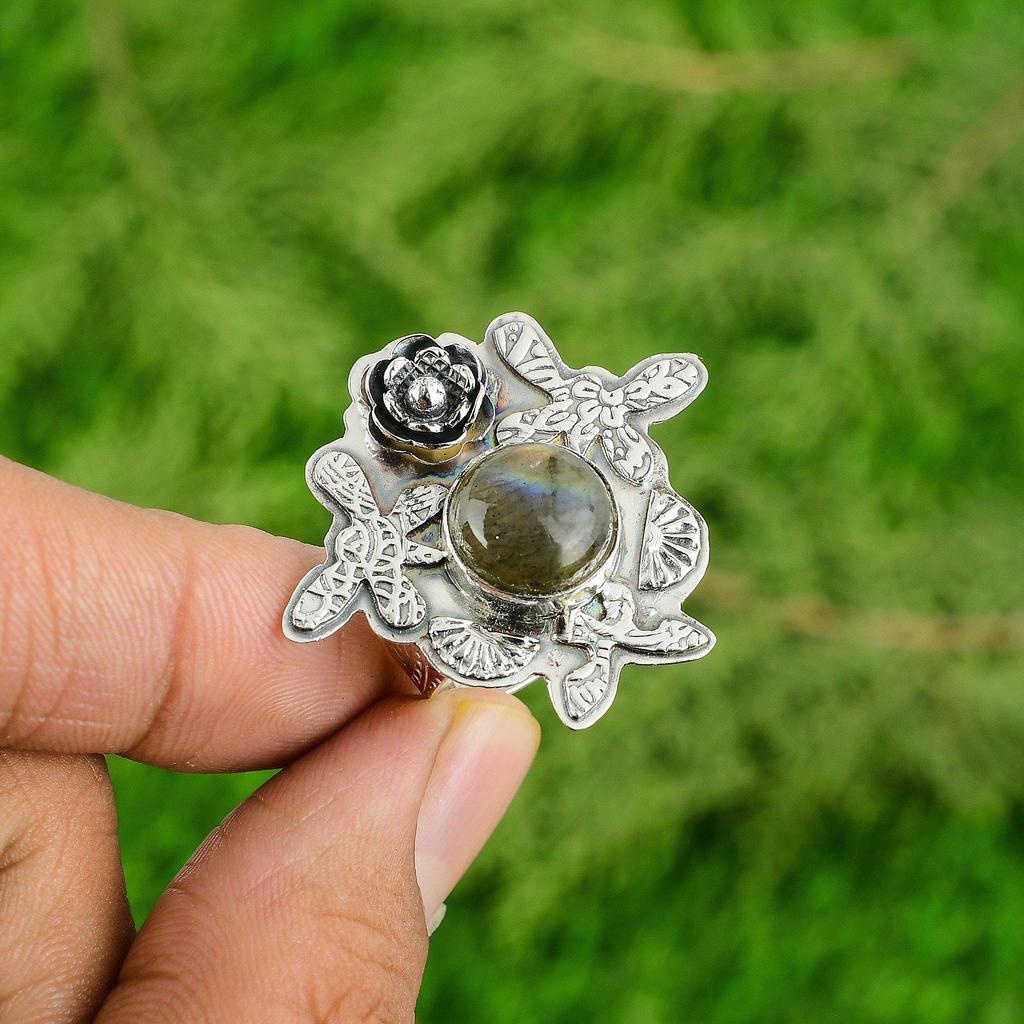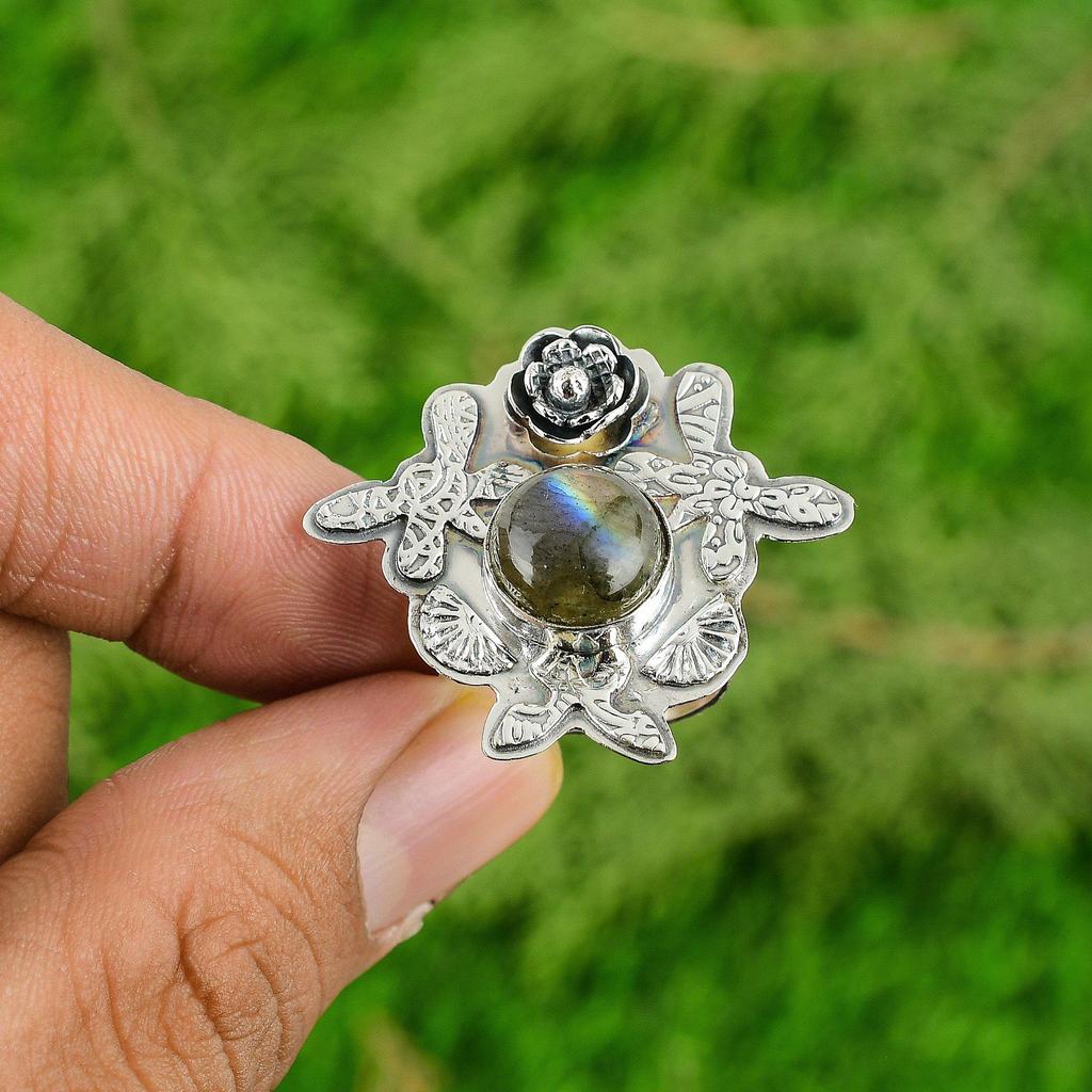 Стерлинговое серебро Натуральный лабрадорит Помолвочное Заявление Цветок Новый Кольцо Ювелирные изделия