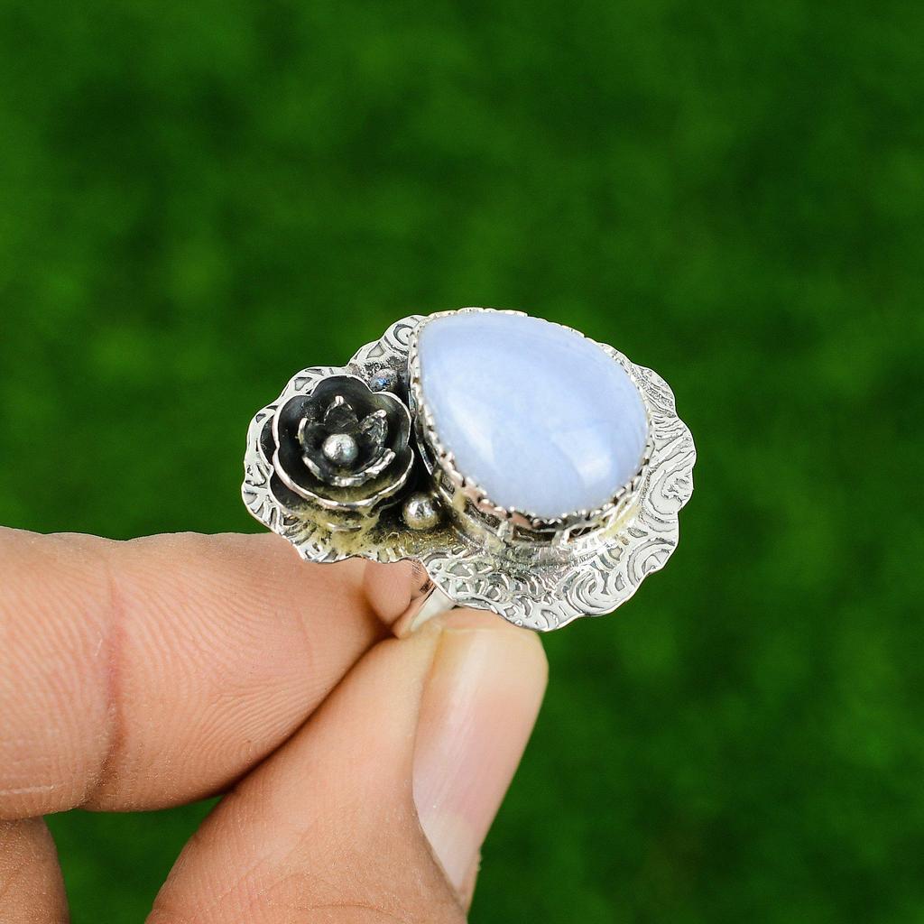 Pear Blue Lace Agate Stone Birthday Flower New Ring Jewelry 925 Sterling Silver