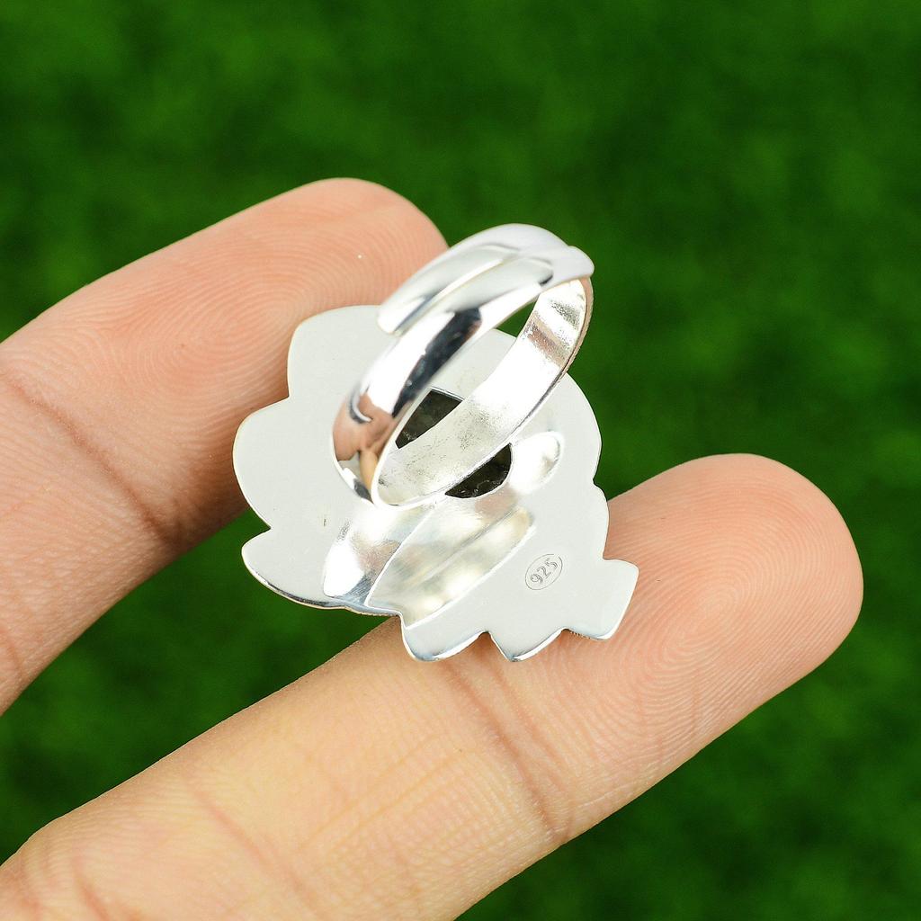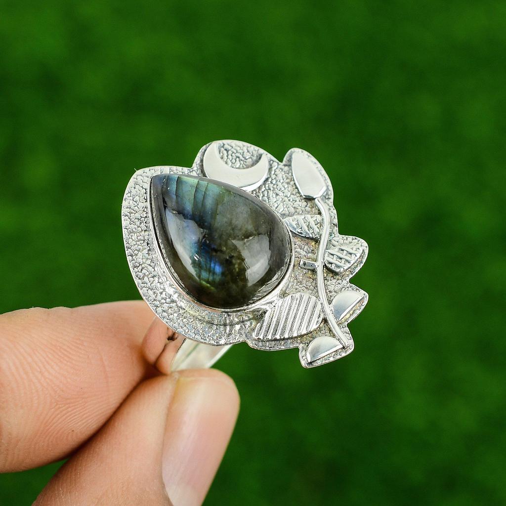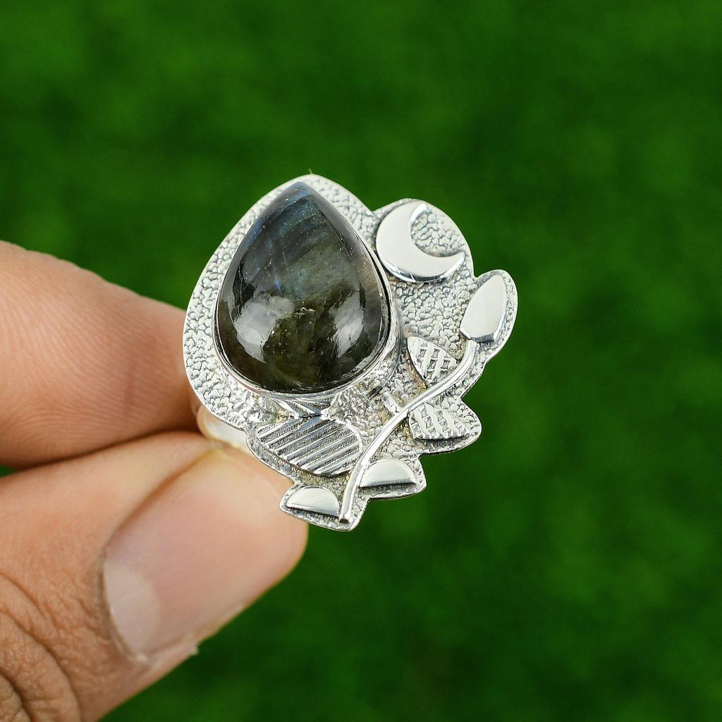 Серебро 925 пробы Груша Натуральный Лабрадорит Ручной работы Кольцо Обещания в виде Полумесяца