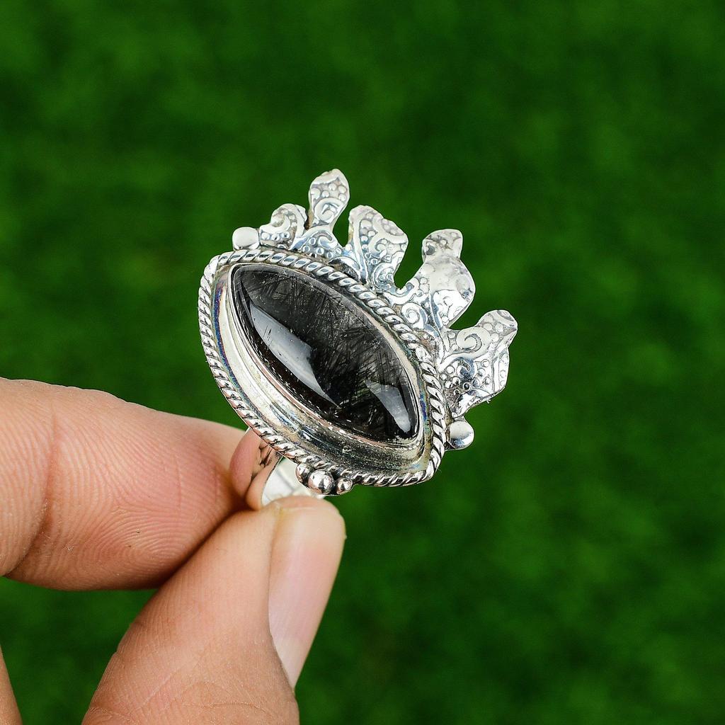 Натуральный камень Рутил Черный 925 Серебро Кольцо Обещания Регулируемое для Женщин