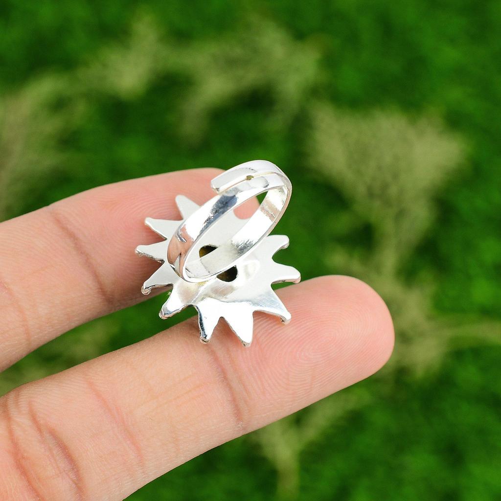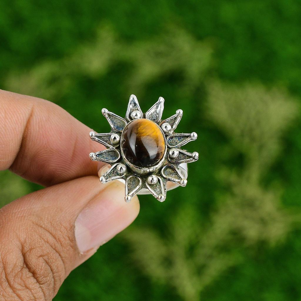 Natural Tiger'S Eye Gemstone Stackable Flower Yellow Adjustable Ring 925 Silver