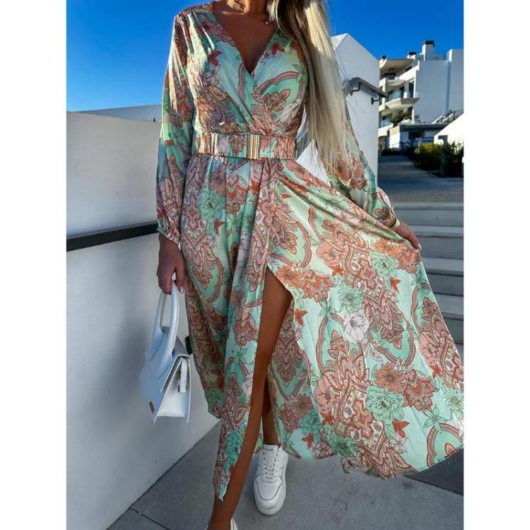 Богемное длинное платье с цветочным принтом, элегантное платье-свинг с глубоким V-образным вырезом, длинными рукавами и высоким разрезом, с поясом, женские пляжные платья, сексуальное