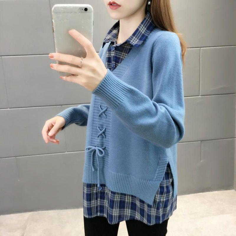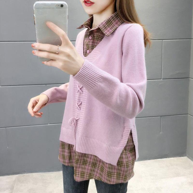 Весенне-осенний свитер-пуловер женский свободного ленивого стиля с лацканами, со стежкой, двухслойный