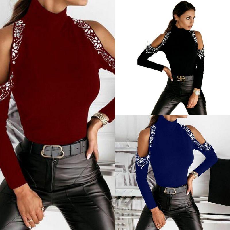 Горячая Распродажа Водолазка Однотонная Футболка с Длинным Рукавом Приталенная Стразы — купить товар онлайн с бесплатной доставкой до всему миру!