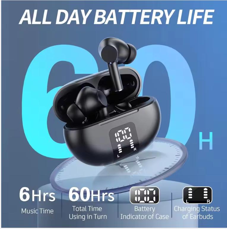 Беспроводные наушники Bluetooth 5.3 Наушники 60 часов воспроизведения Светодиодный дисплей питания Вкладыши Микрофон Шумоподавление Стереозвук Наушники