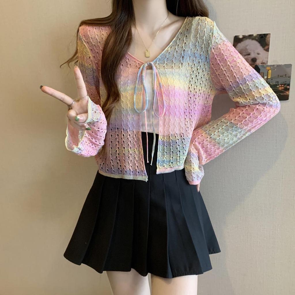 Летняя радуга, ажурный вязаный кардиган из ледяного шелка, пальто, защита от солнца, верхняя одежда, короткий, милый, пикантный, дофаминовый топ