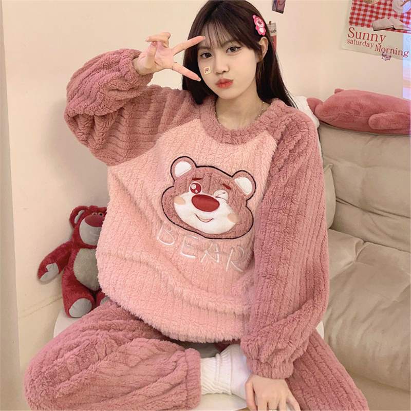 Новая осенне-зимняя плюшевая пижама с круглым воротником для женщин, утолщенная теплая милая мультяшная фланелевая домашняя одежда