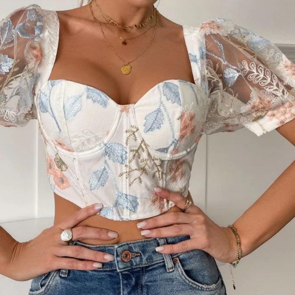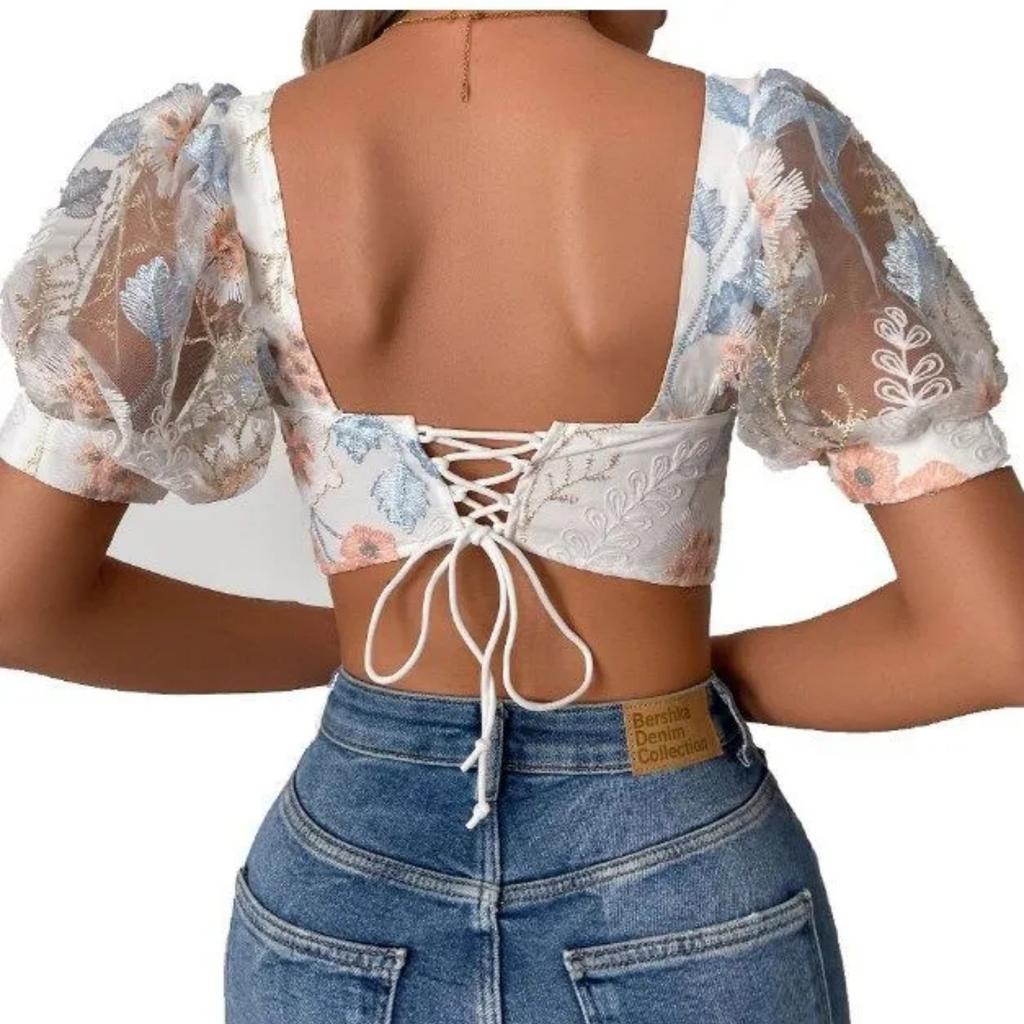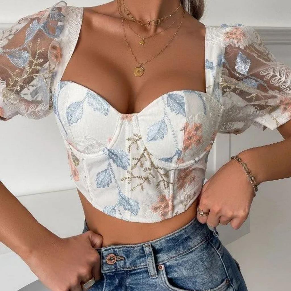 Французская женская сексуальная короткая шифоновая рубашка с пышными рукавами и цветочным принтом на косточках с кружевным топом на груди