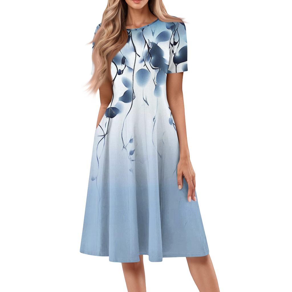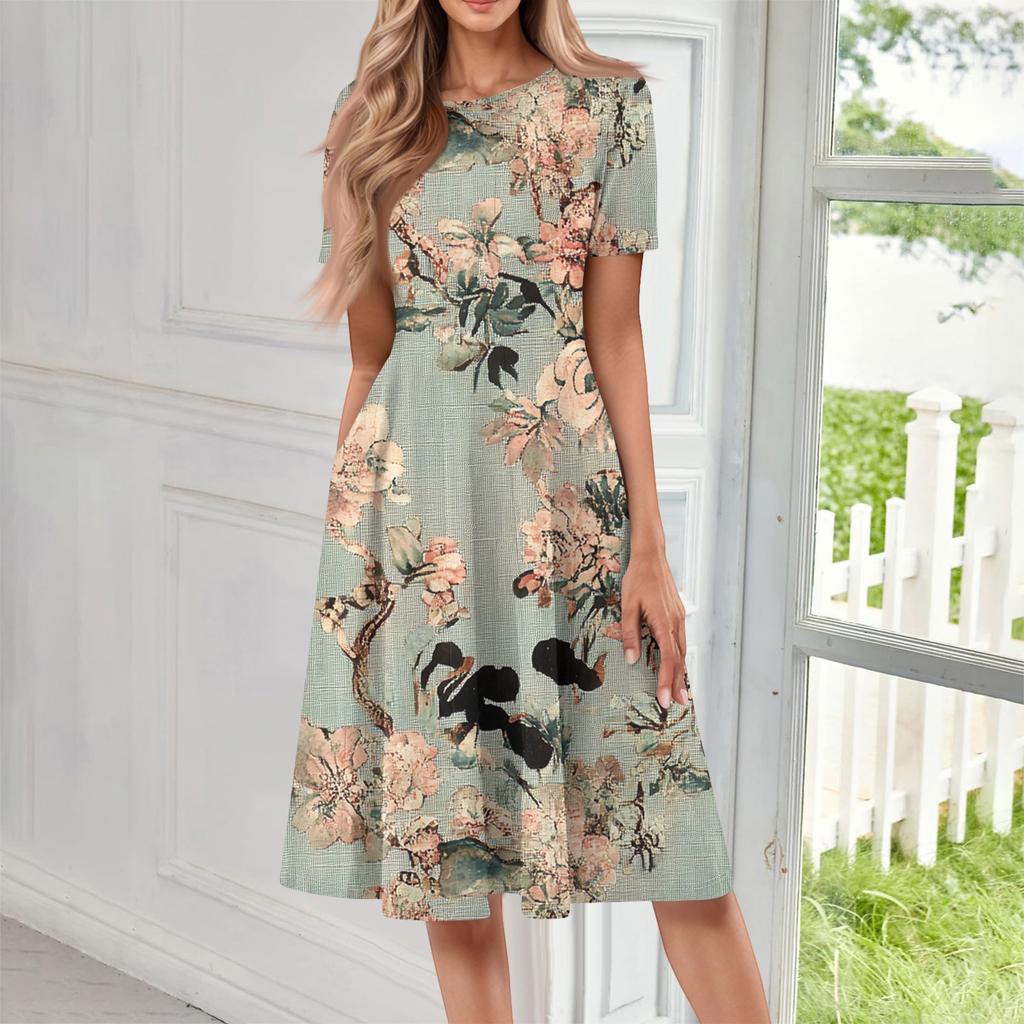 Женское повседневное модное платье миди с круглым вырезом и коротким рукавом с принтом
