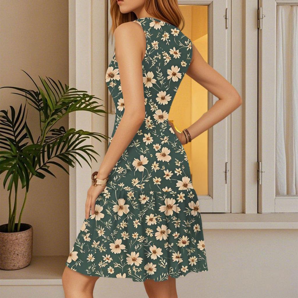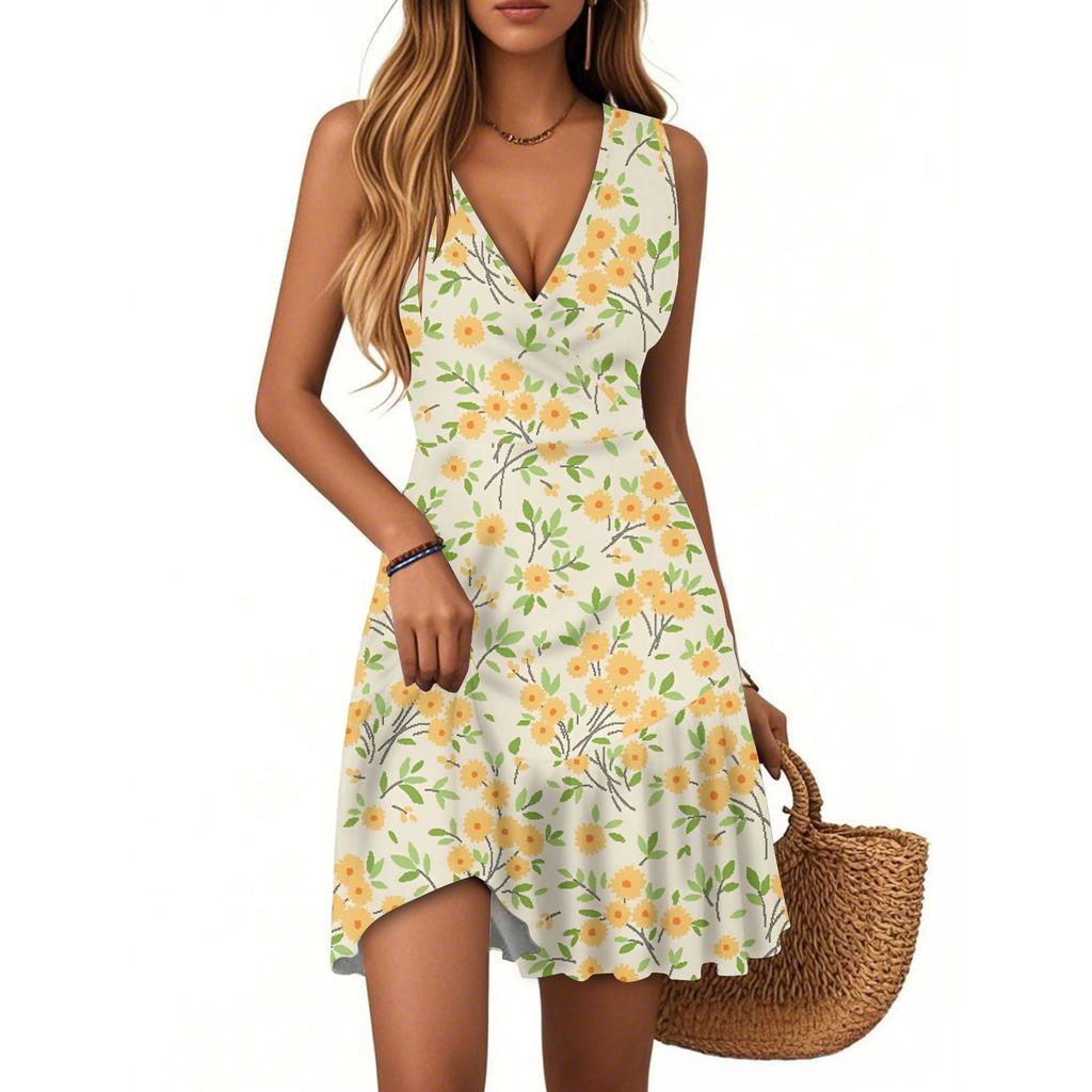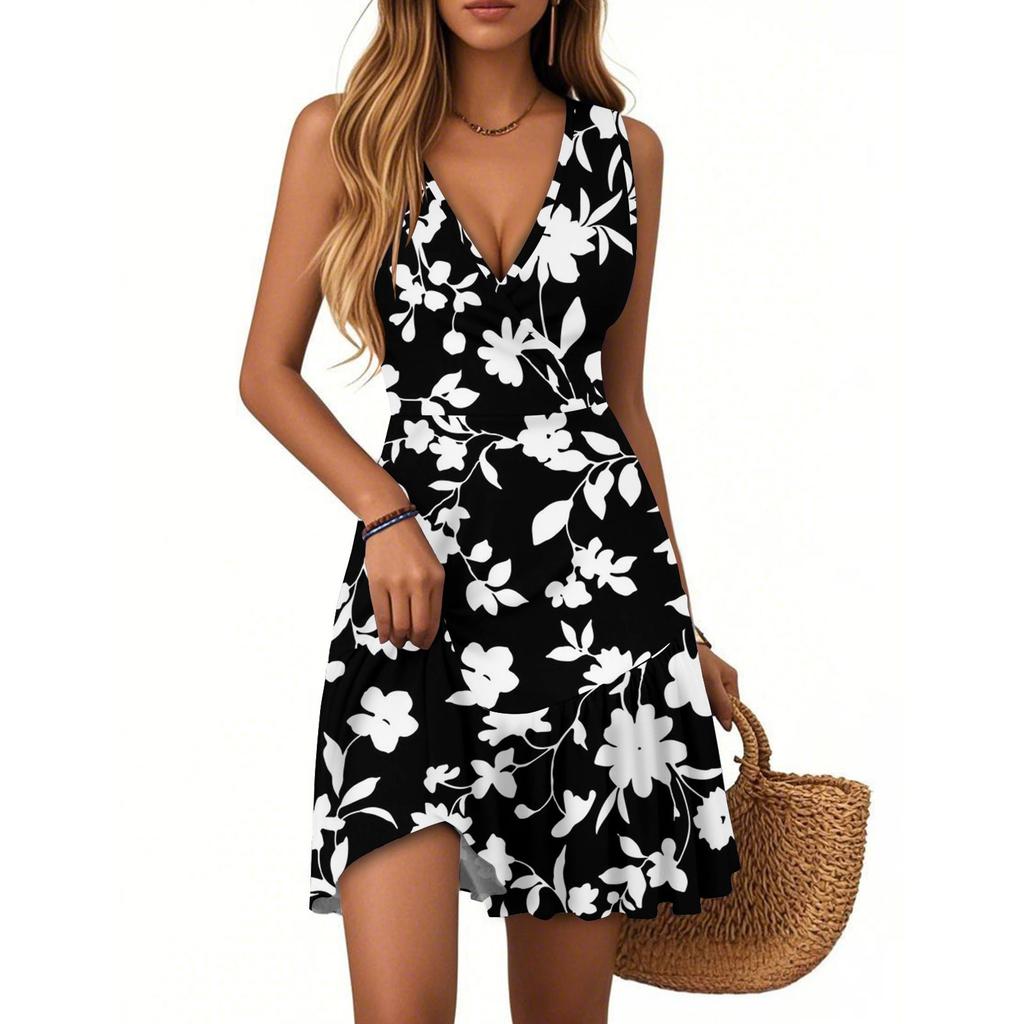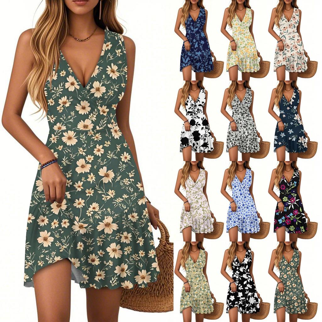 Женское платье с V-образным вырезом, без рукавов, повседневное, с цветочным принтом, плиссированное платье