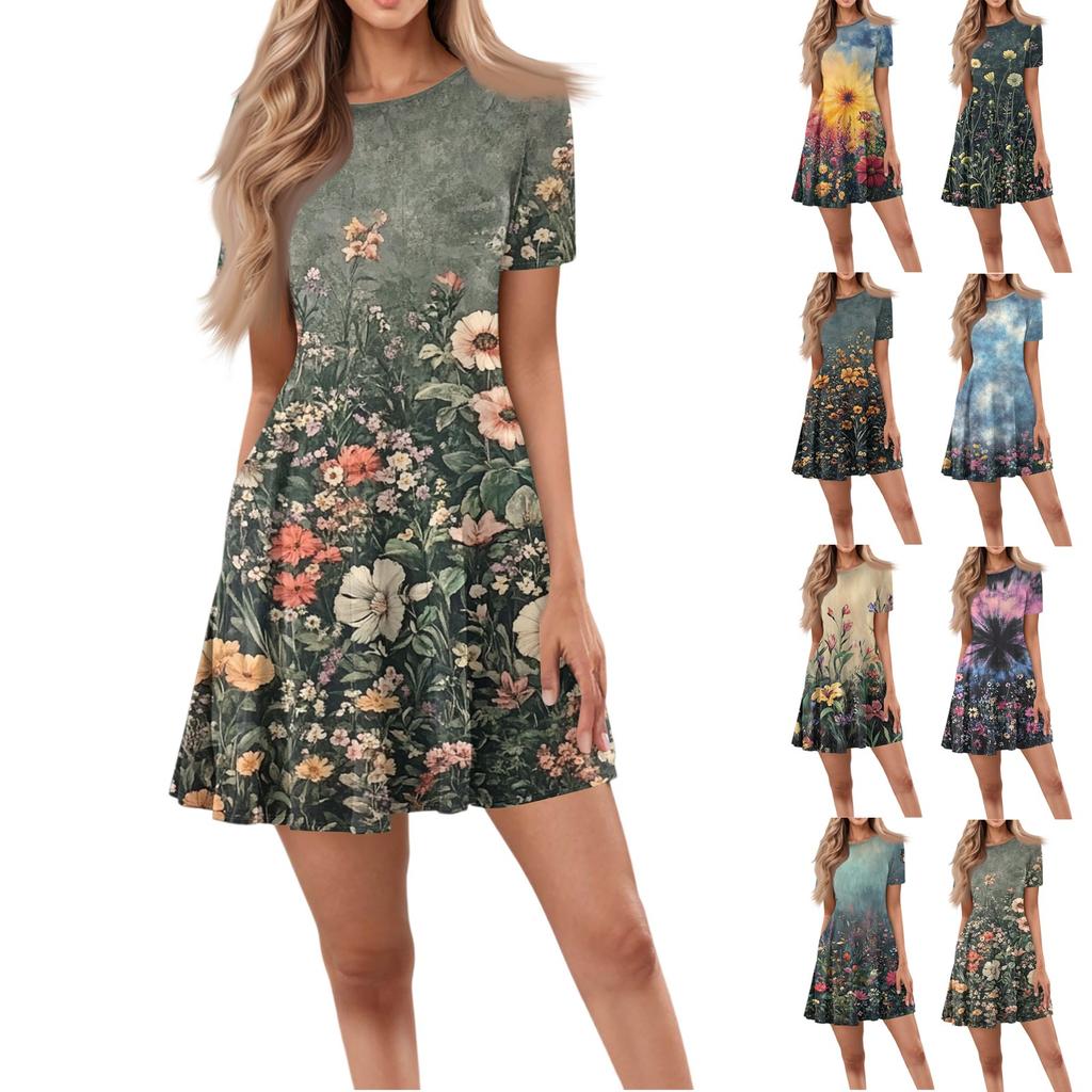 Женское повседневное модное короткое платье с круглым вырезом и коротким рукавом с цветочным принтом и карманами — купить товар онлайн с бесплатной доставкой до всему миру!