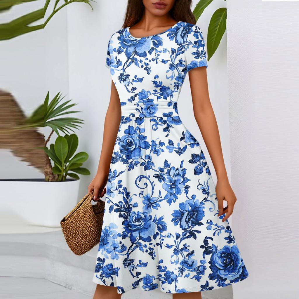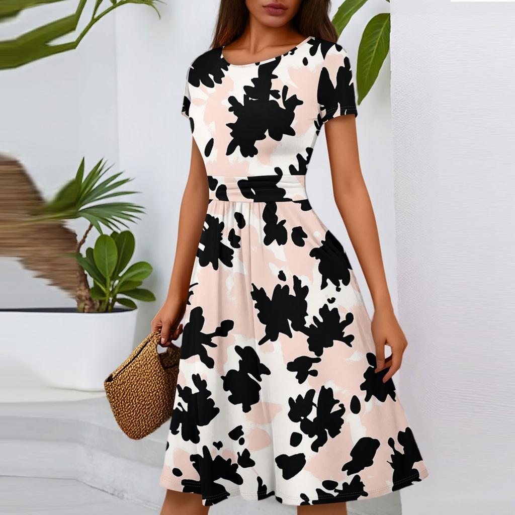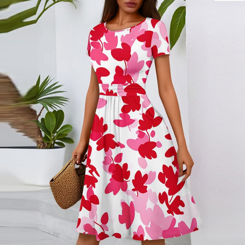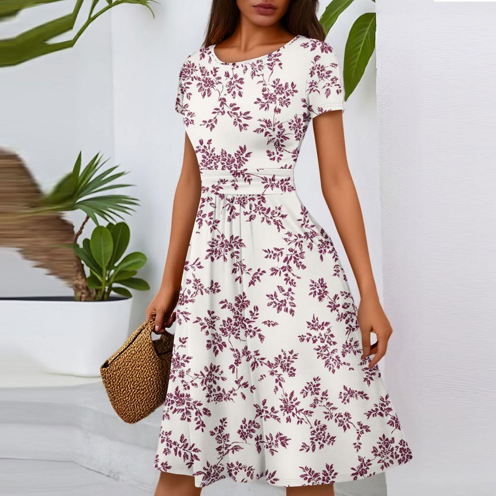 Женское повседневное модное платье миди А-силуэта с круглым вырезом, плиссированными короткими рукавами и цветочным принтом
