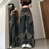 Американский винтаж, джинсы с вышивкой в виде пятиконечной звезды с необработанным краем для женщин, уличный стиль, нишевые, оверсайз, прямой крой, длинные брюки