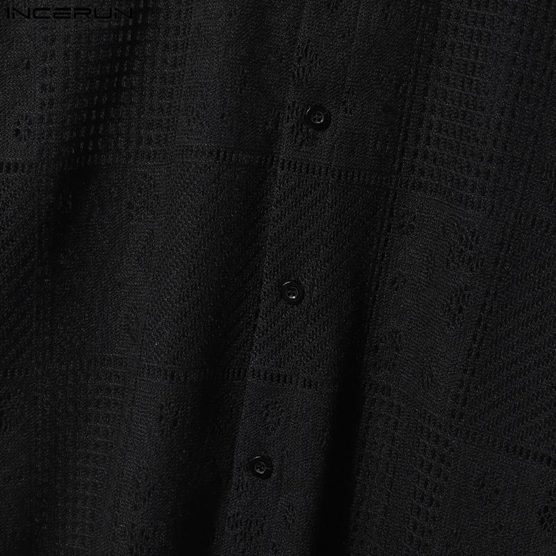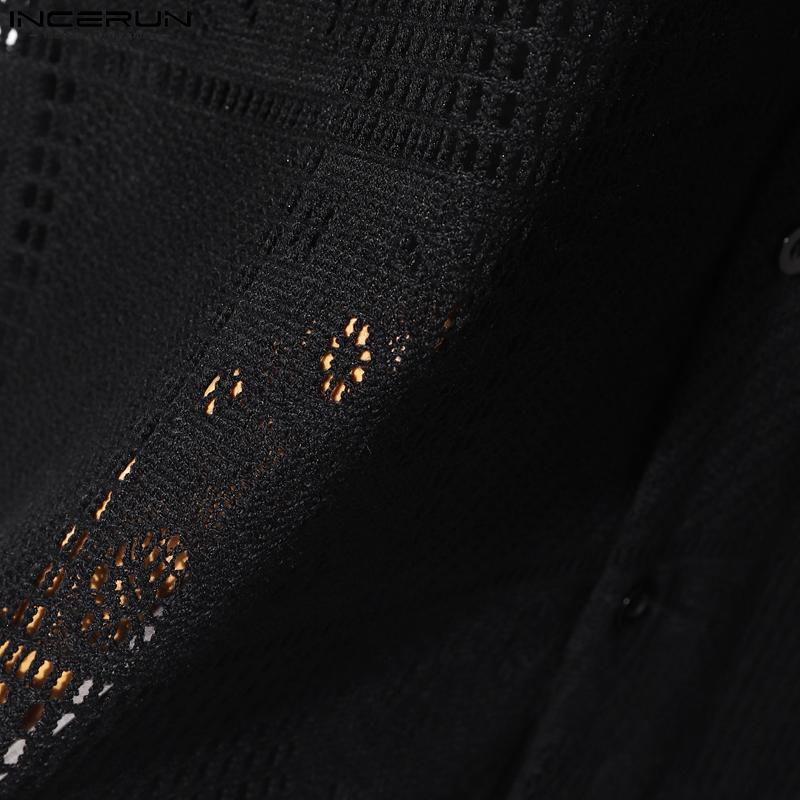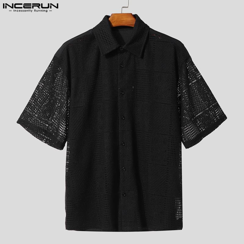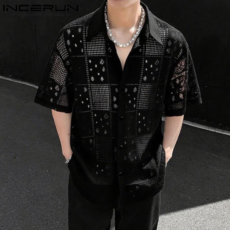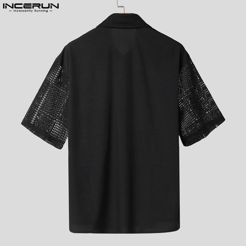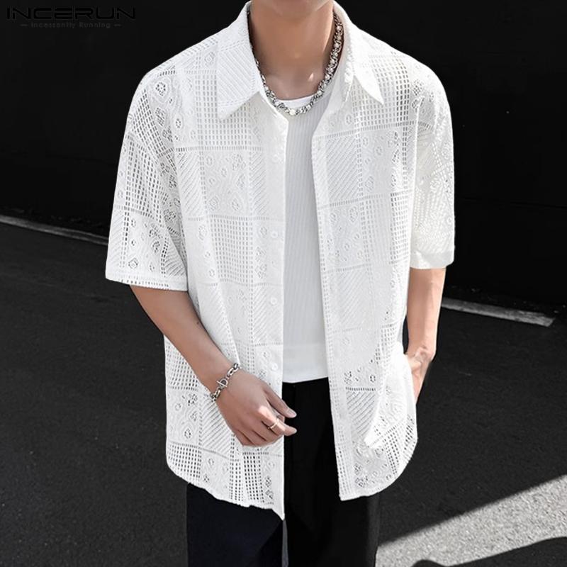 INCERUN Мужские рубашки оверсайз с коротким рукавом, кружевной ажурной вставкой, повседневные свободные топы