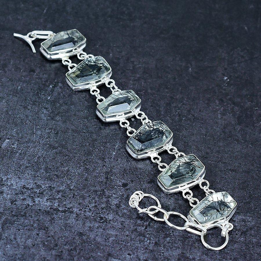 Натуральный камень Рутил Черный Рутил Ручной работы Серебро 925 пробы Браслет 7-8" u8t79