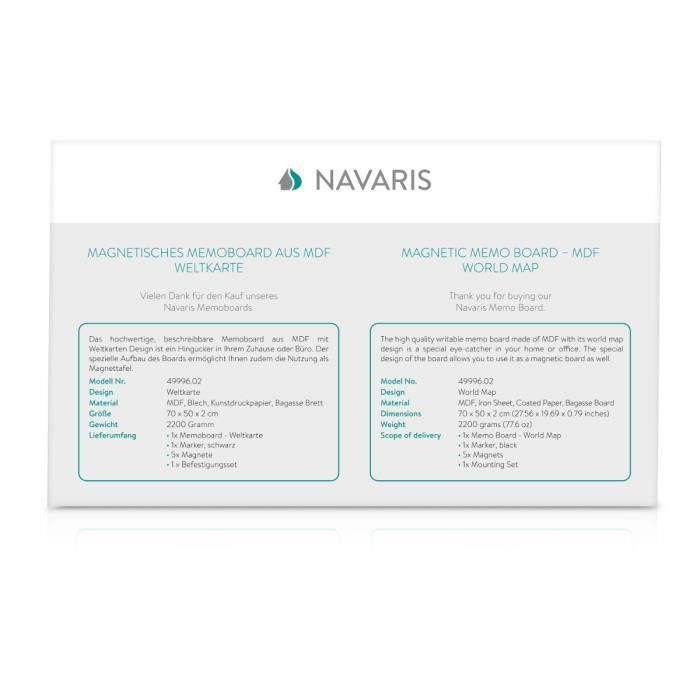 Tableau magnétique - Navaris - 70 x 50 cm - Design carte du monde - Effaçable - 5 aimants inclus
