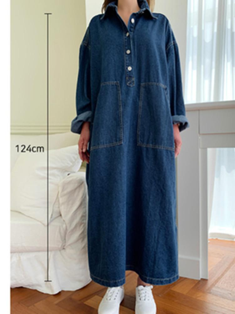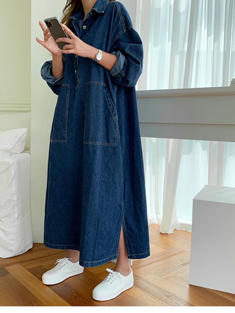 Женское джинсовое платье стойка воротник длинный рукав на пуговицах длинное платье свободное шикарное с разрезом кулиска макси платье