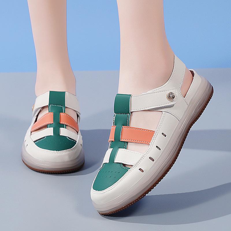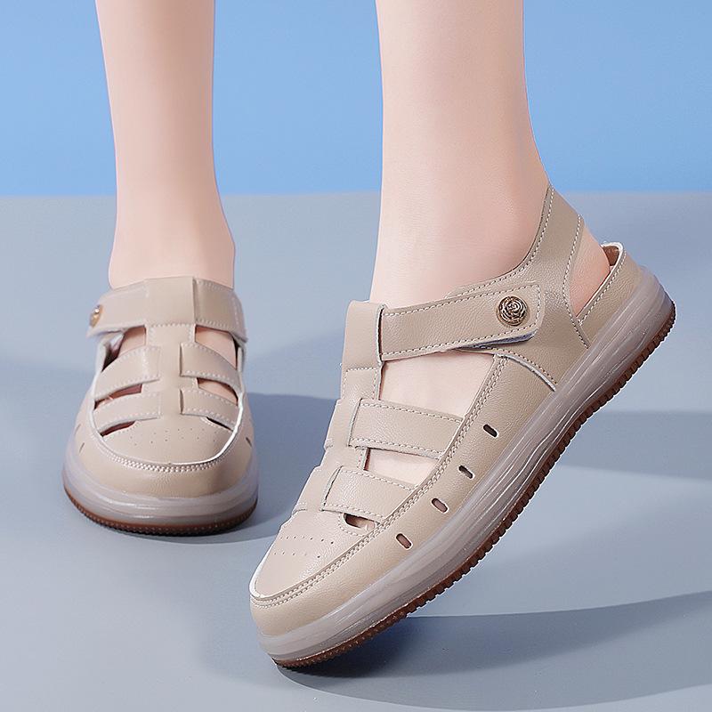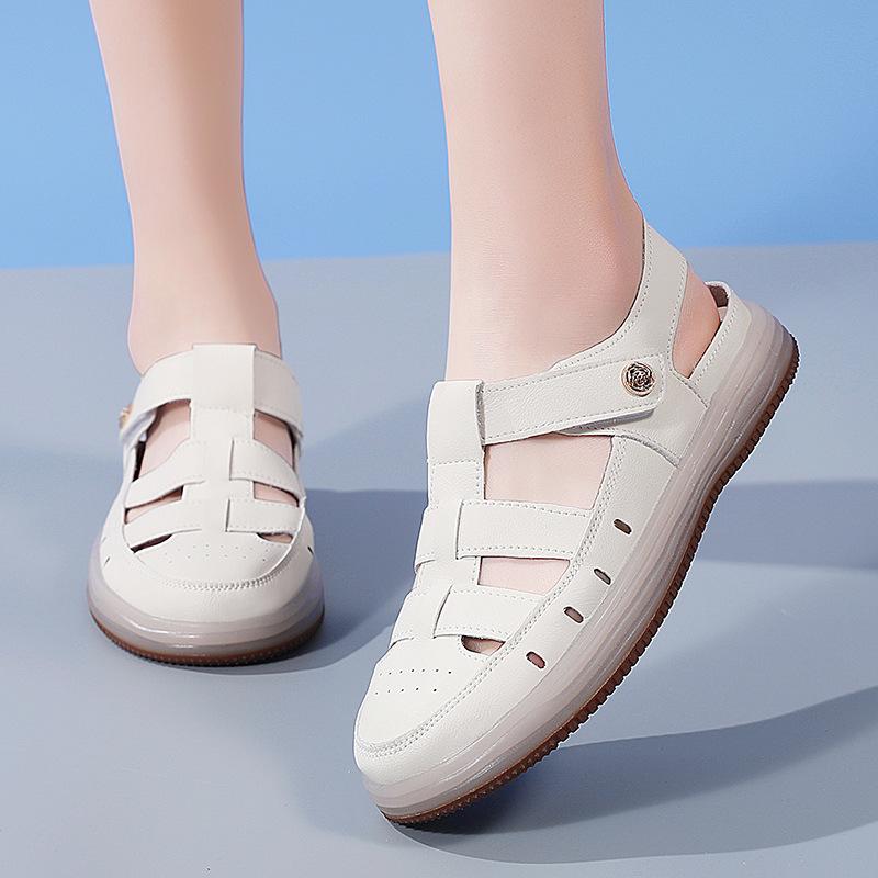 Новые летние модные повседневные сандалии из коровьей кожи с перфорацией, универсальные сандалии на плоской подошве для комфорта мамы