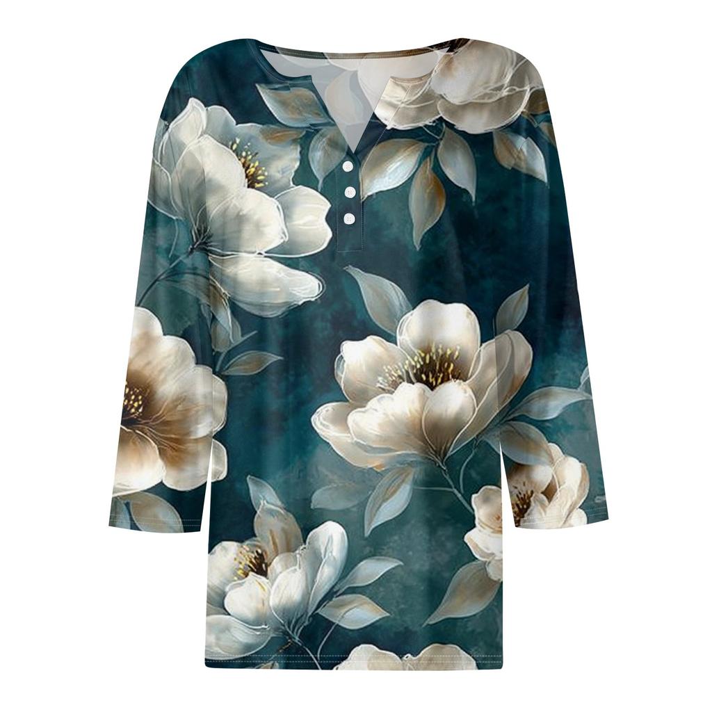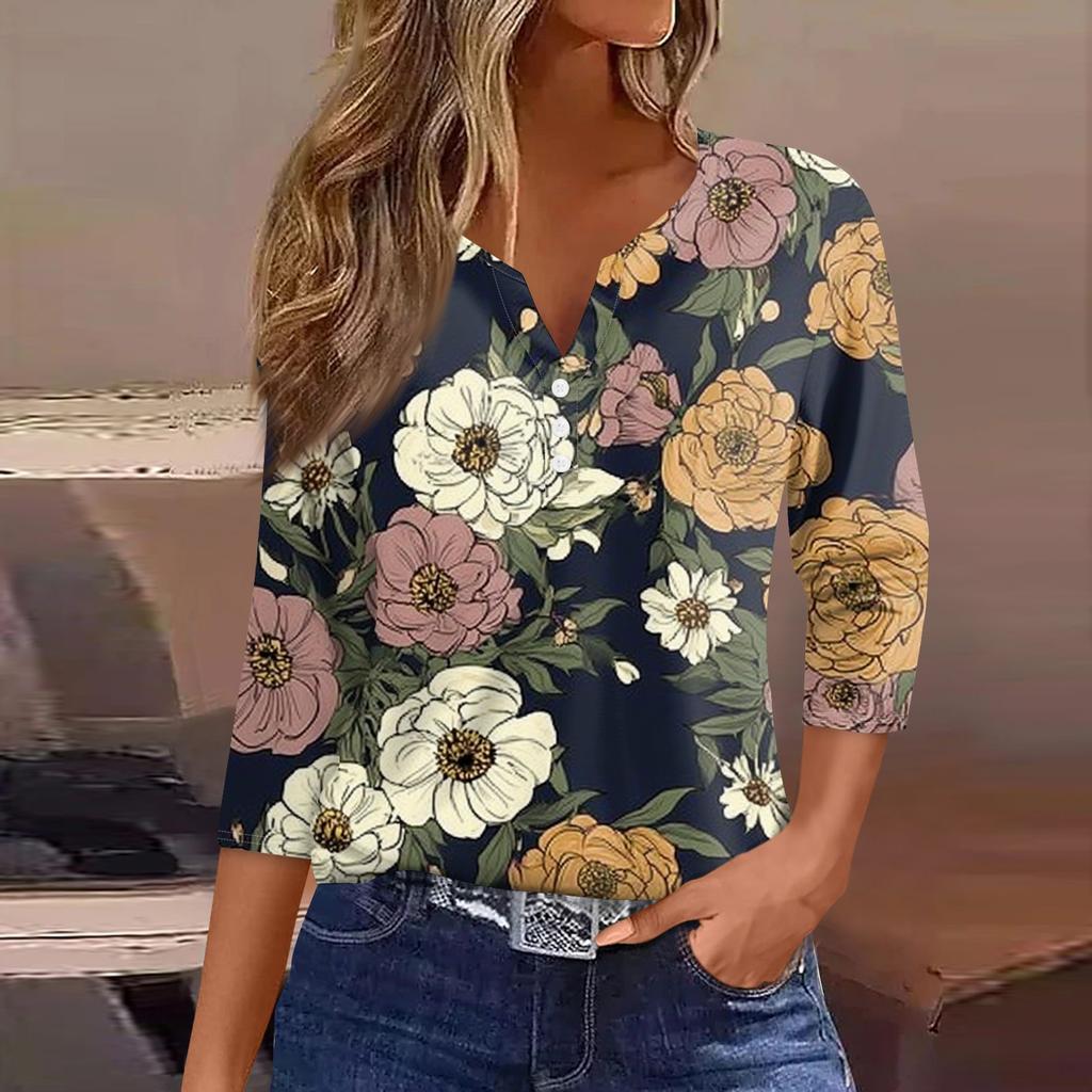 Женская модная повседневная футболка с v-образным вырезом и декоративными пуговицами, рукавом три четверти, с цветочным принтом, топ