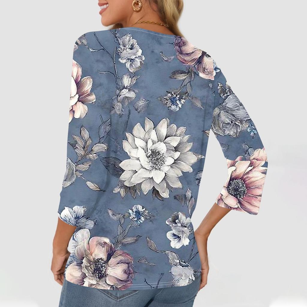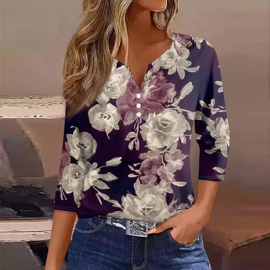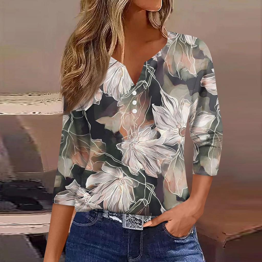 Женская модная повседневная футболка с v-образным вырезом и декоративными пуговицами, рукавом три четверти, с цветочным принтом, топ