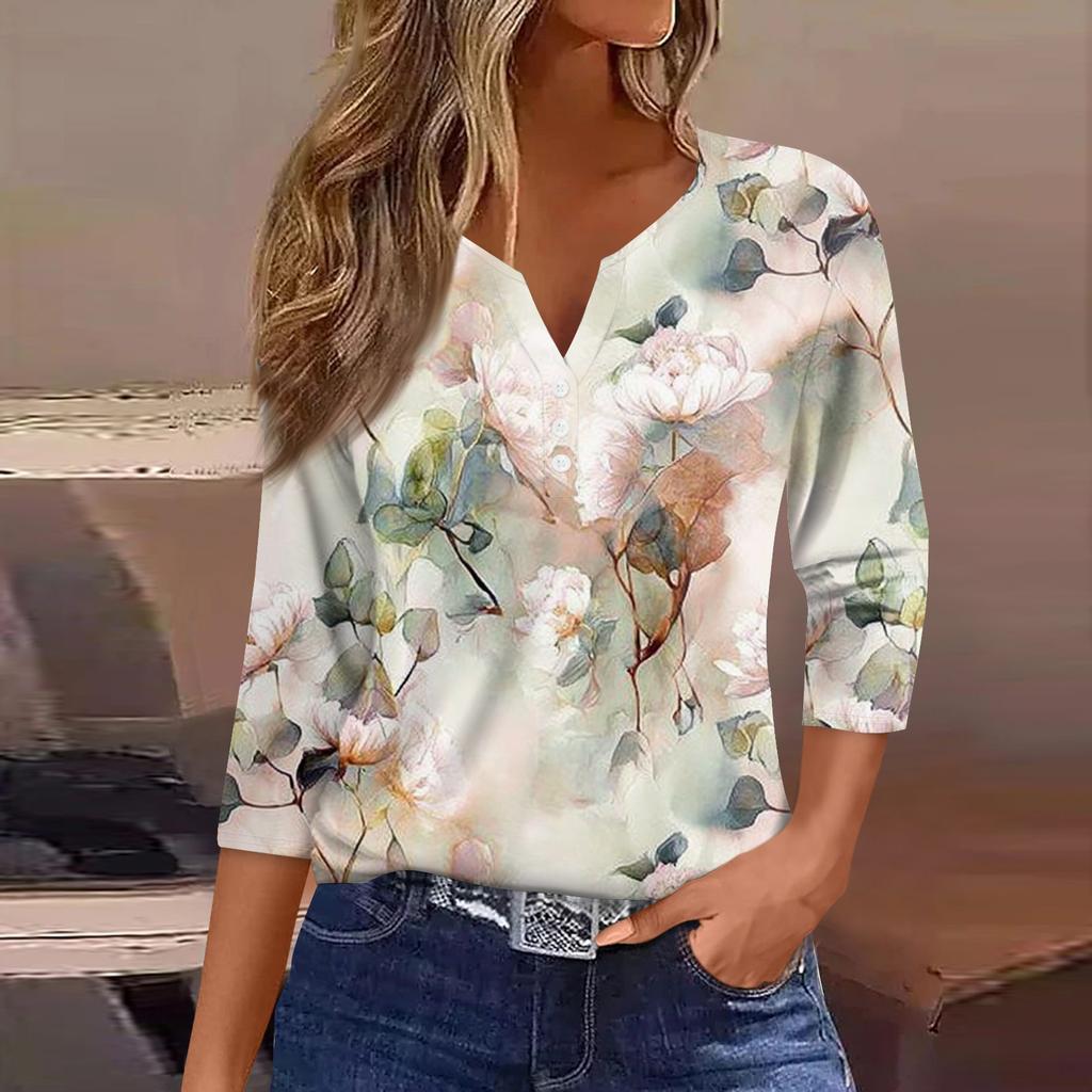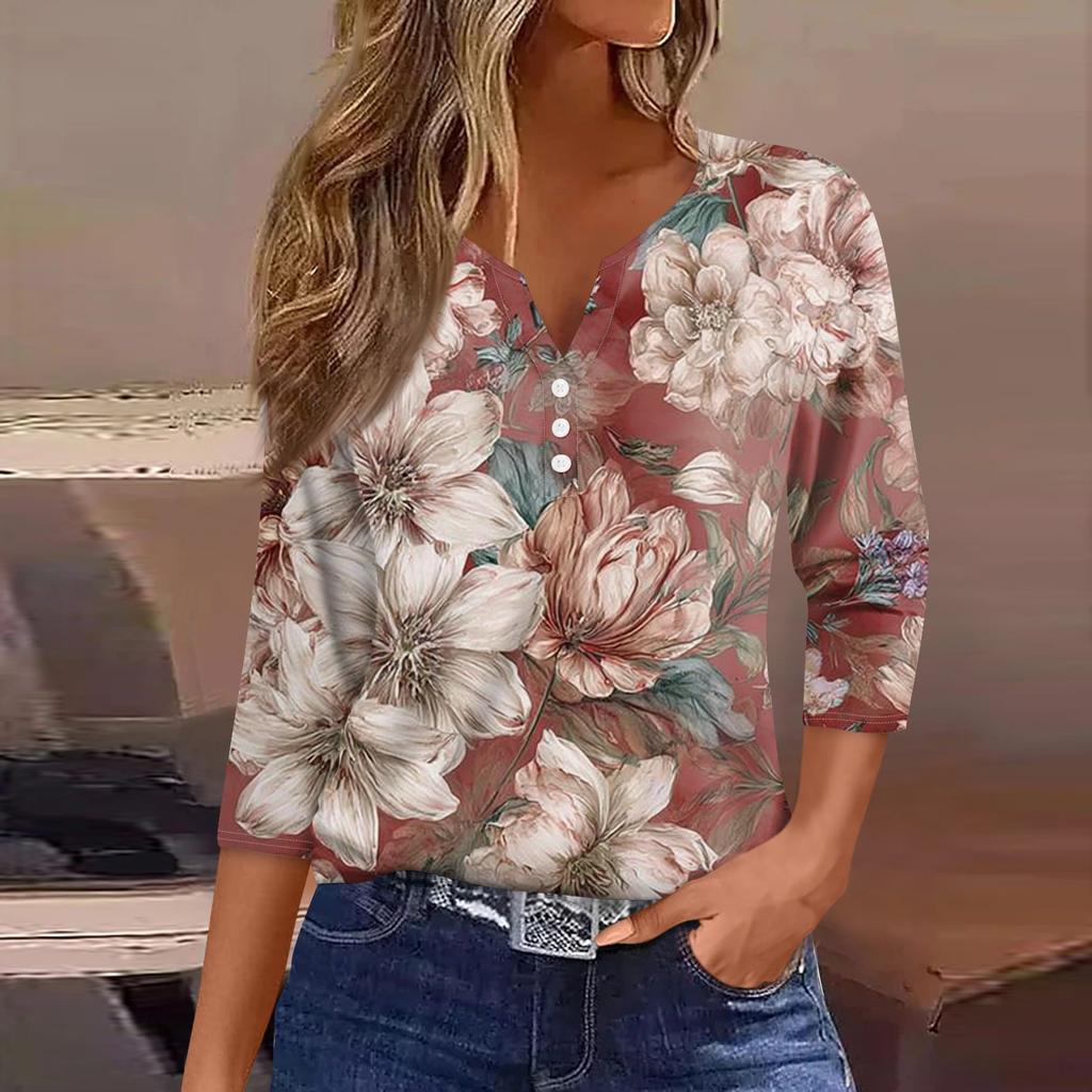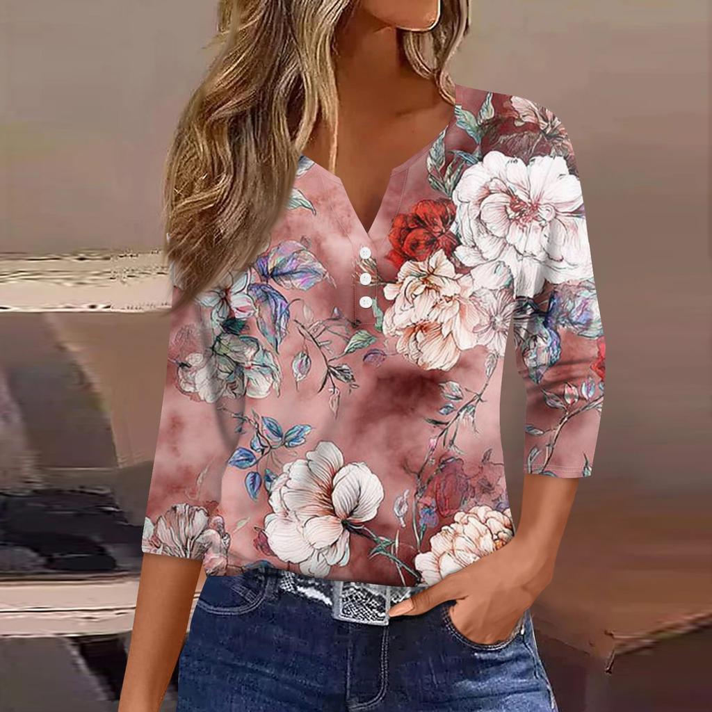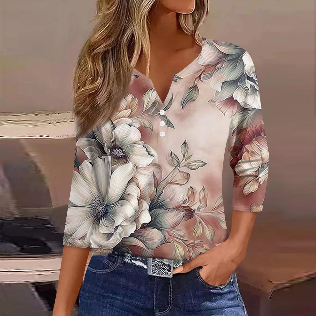 Женская модная повседневная футболка с v-образным вырезом и декоративными пуговицами, рукавом три четверти, с цветочным принтом, топ