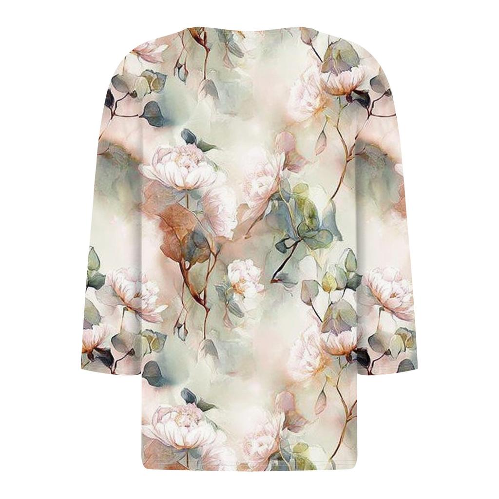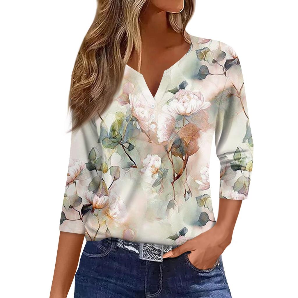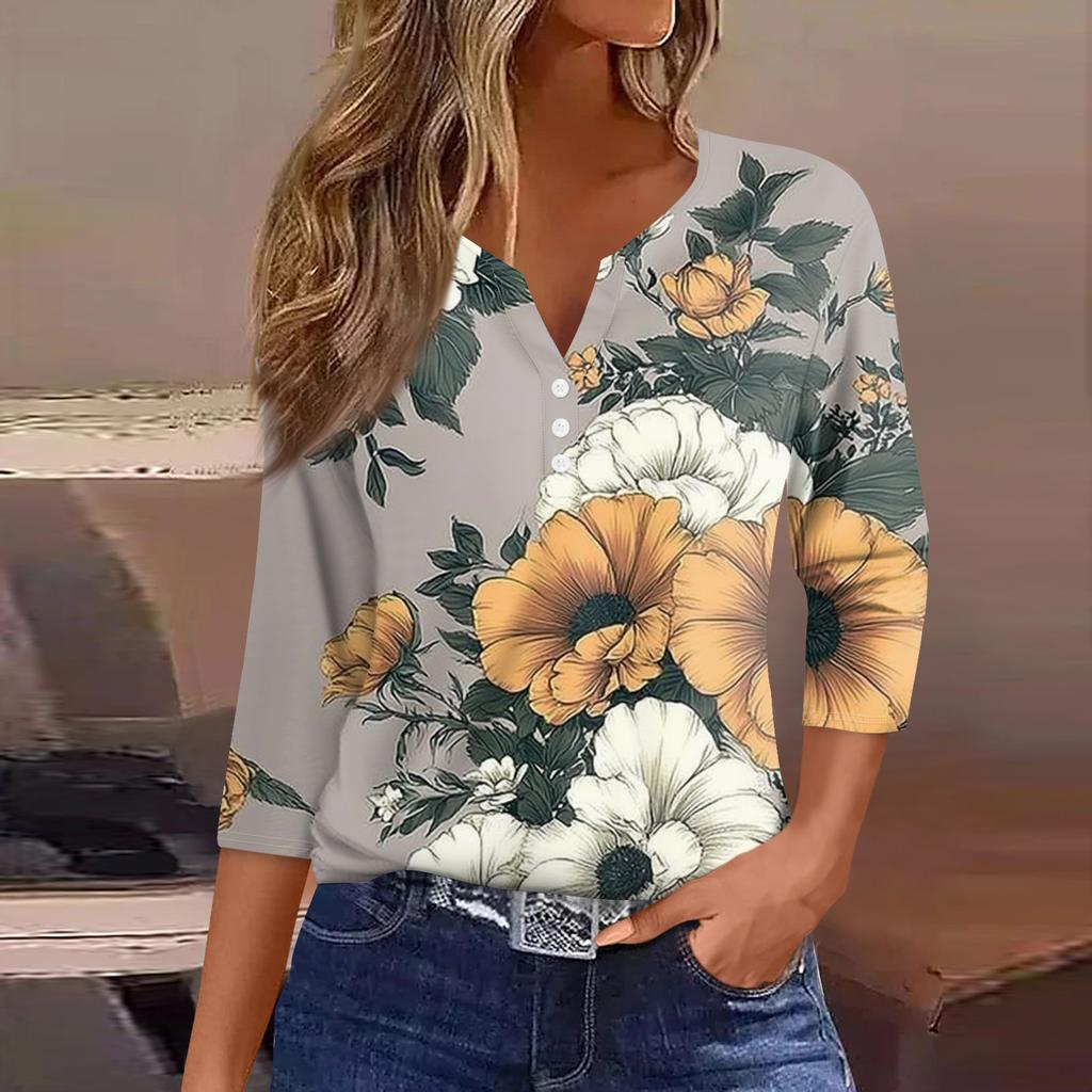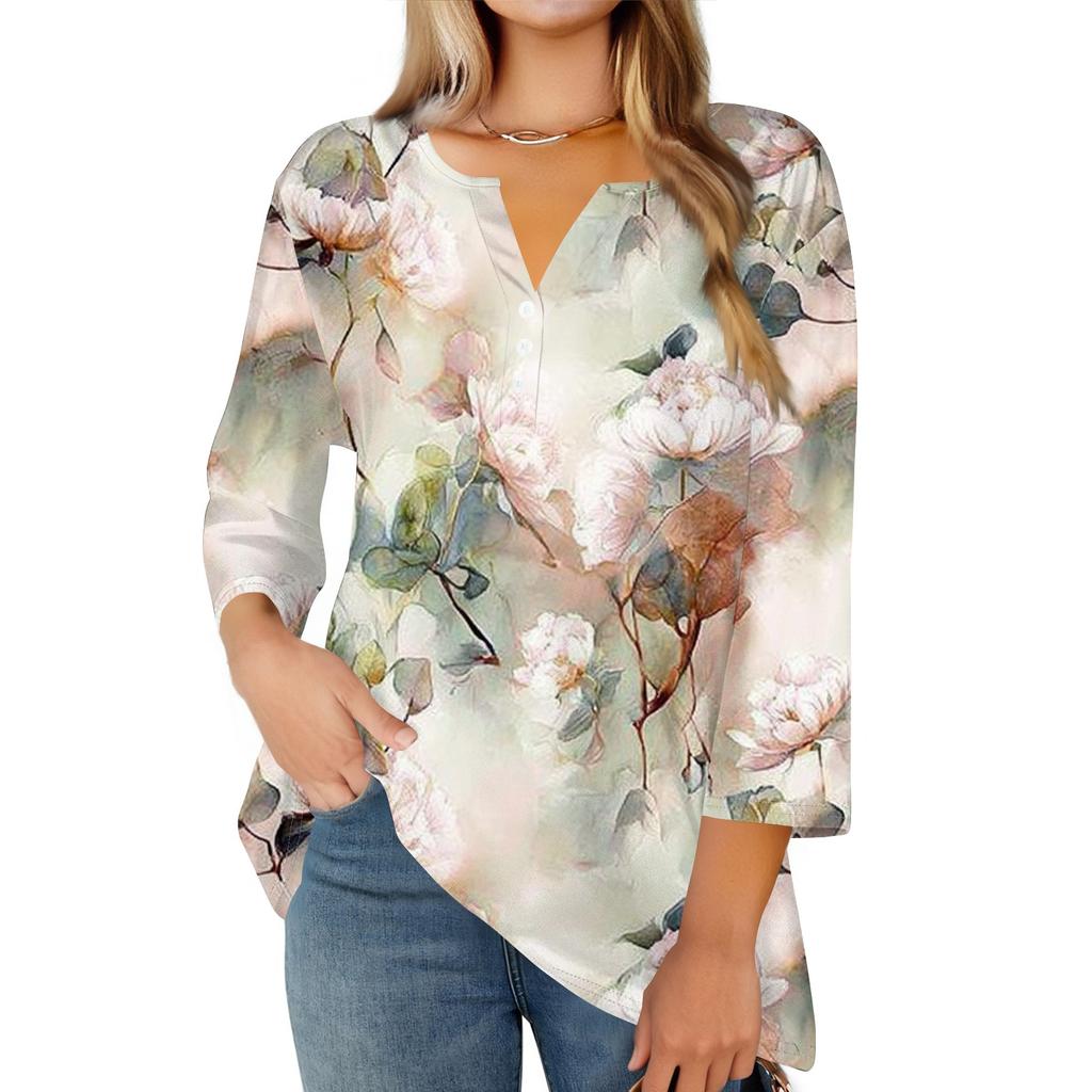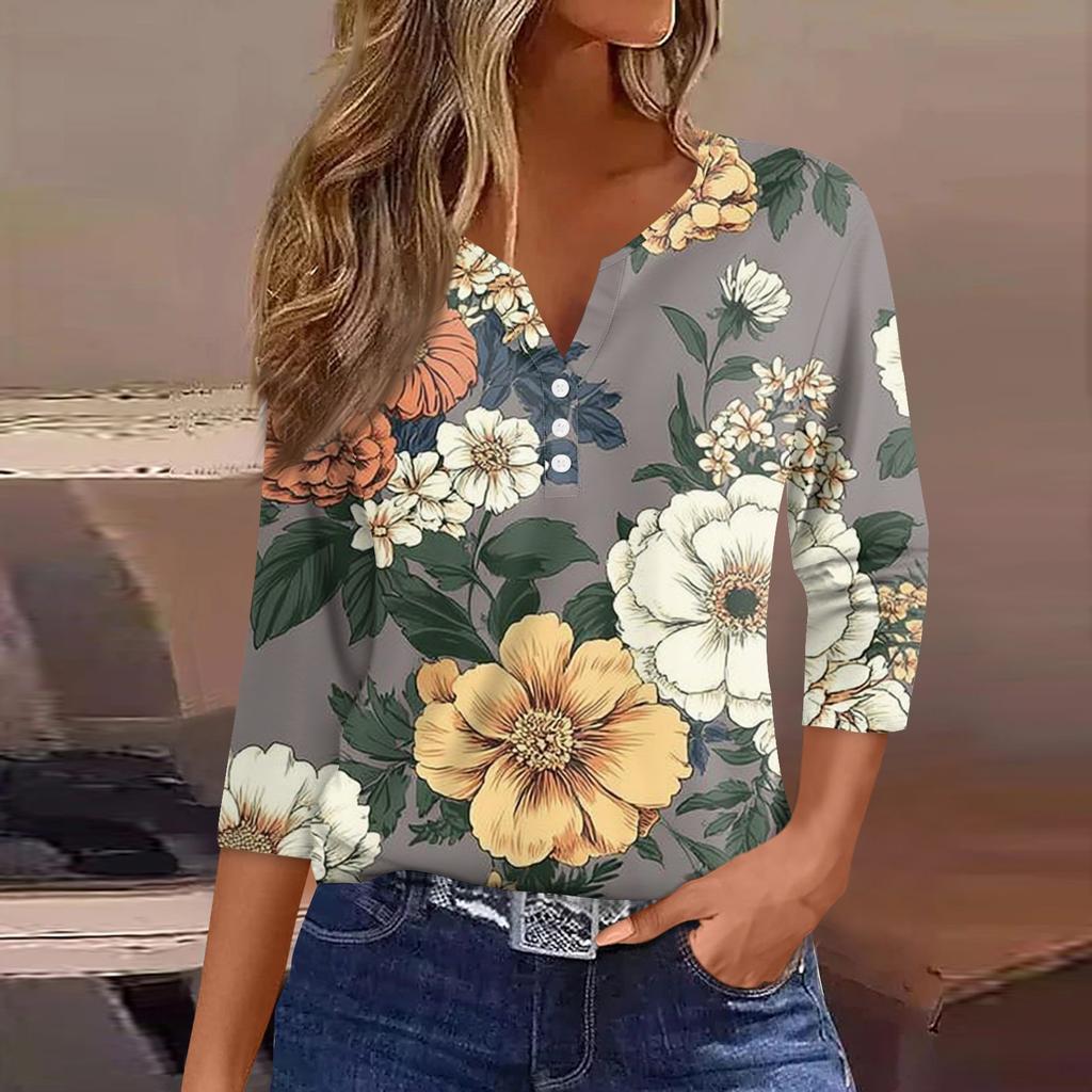 Женская модная повседневная футболка с v-образным вырезом и декоративными пуговицами, рукавом три четверти, с цветочным принтом, топ