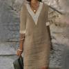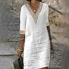 Женское однотонное хлопково-льняное повседневное платье с v-образным вырезом и кружевом среднего размера — купить товар онлайн с бесплатной доставкой по всему миру!