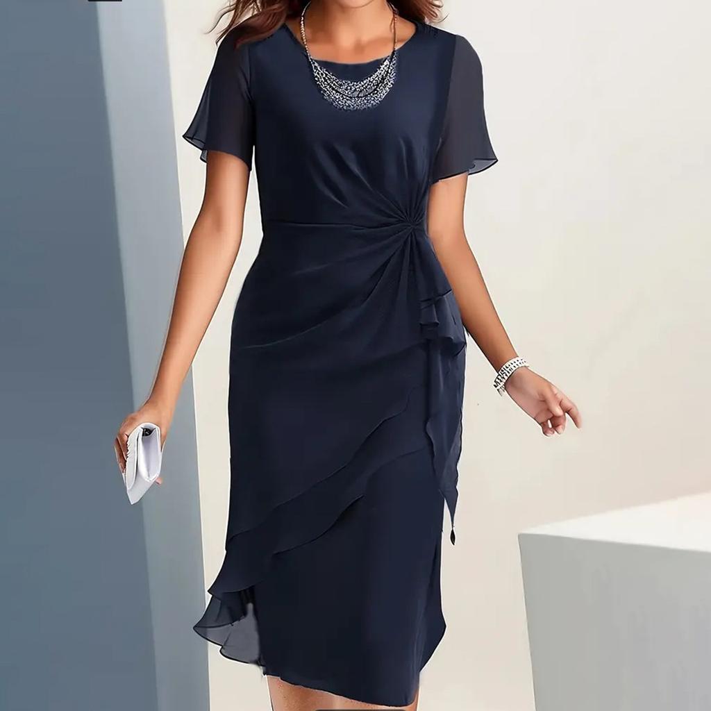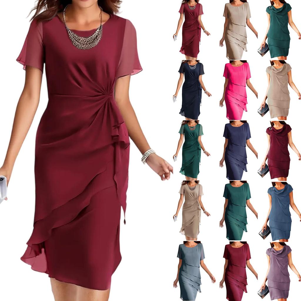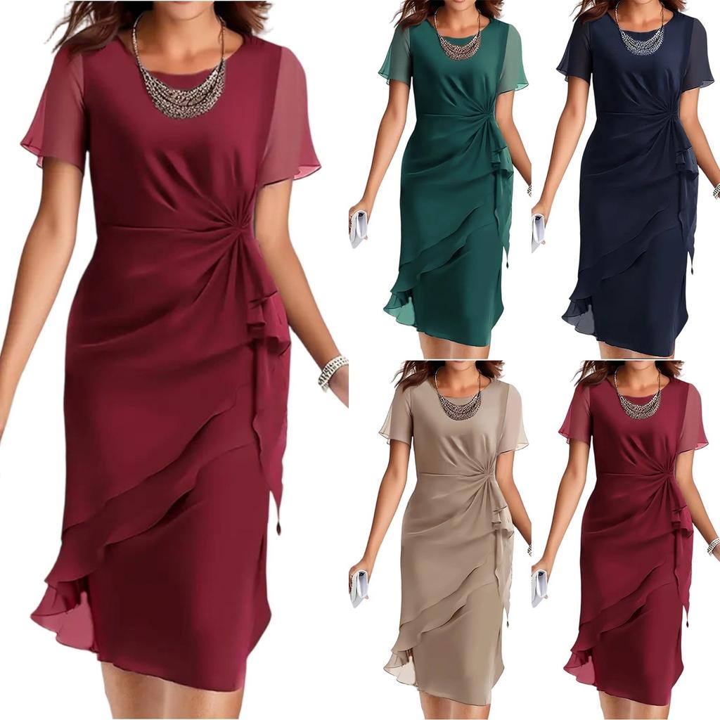 Женское летнее платье, облегающее платье, однотонное шифоновое платье с круглым вырезом и короткими рукавами