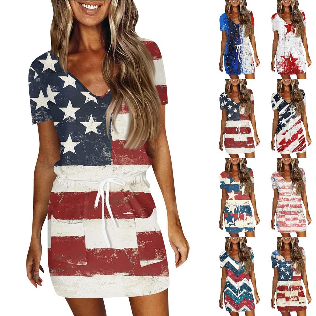 Женское летнее повседневное модное платье с короткими рукавами и кулиской на день независимости — купить товар онлайн с бесплатной доставкой по всему миру!