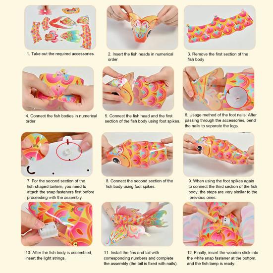 Традиционный шарм: Наполните традиционную китайскую культуру современной эстетикой с помощью нашего набора для изготовления фонарей своими руками. Эти фонари, украшенные восхитительными мультяшными рисунками золотых рыбок, добавляют нотку элегантности таким праздникам, как Праздник середины осени и Праздник весны.