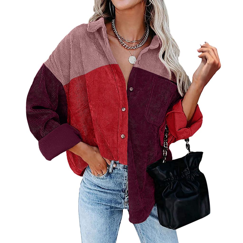 Женская осенне-зимняя свободная вельветовая куртка-рубашка с длинными рукавами и цветными блоками