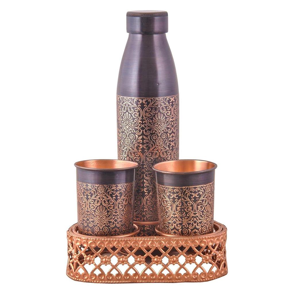 Бутылка из чистой меди с античной отделкой и 2 медными стаканами с травлением для подарка и питья. Объем - 1 литр. (Набор из 1 бутылки + 2 стаканов)