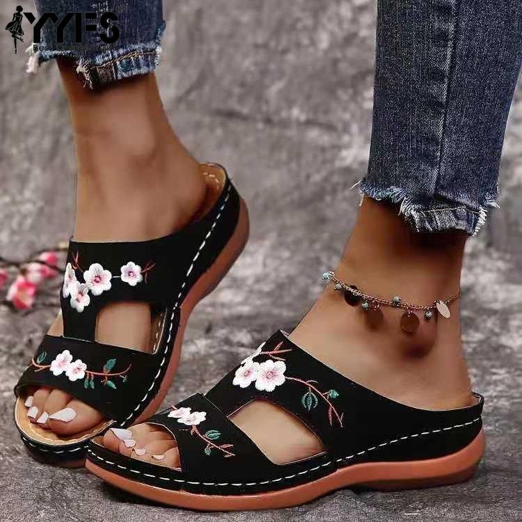 Летние женские сандалии на танкетке Премиум Открытый носок Ортопедические шлепанцы Винтажная Нескользящая кожа Повседневная Вышитая платформа Женская обувь — купить товар онлайн с бесплатной доставкой по всему миру!